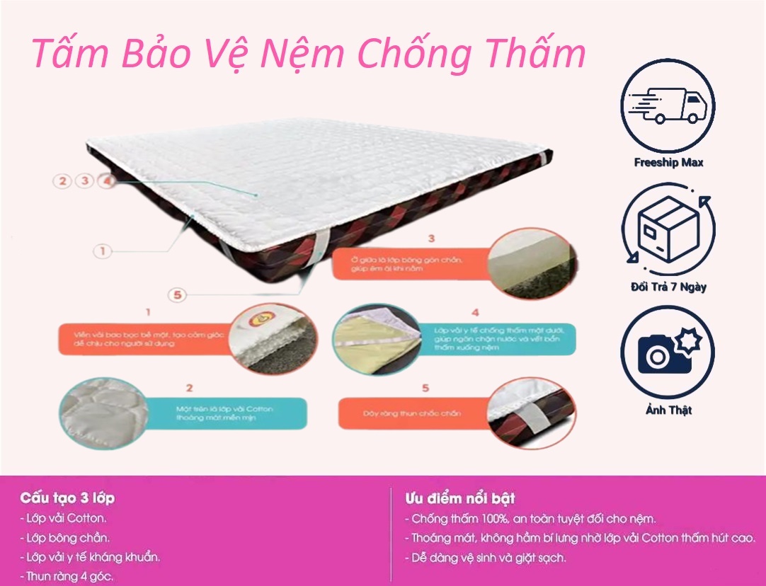 Tấm lót bảo vệ nệm chống thấm 100% giúp bạn giải quyết triệt để vấn đề nước đổ lên nệm, hay bé tè dầm, nôn ói làm nệm bị dơ và có mùi khó chịu.