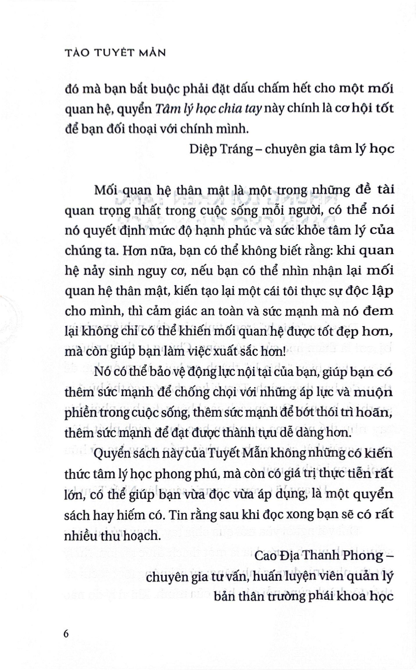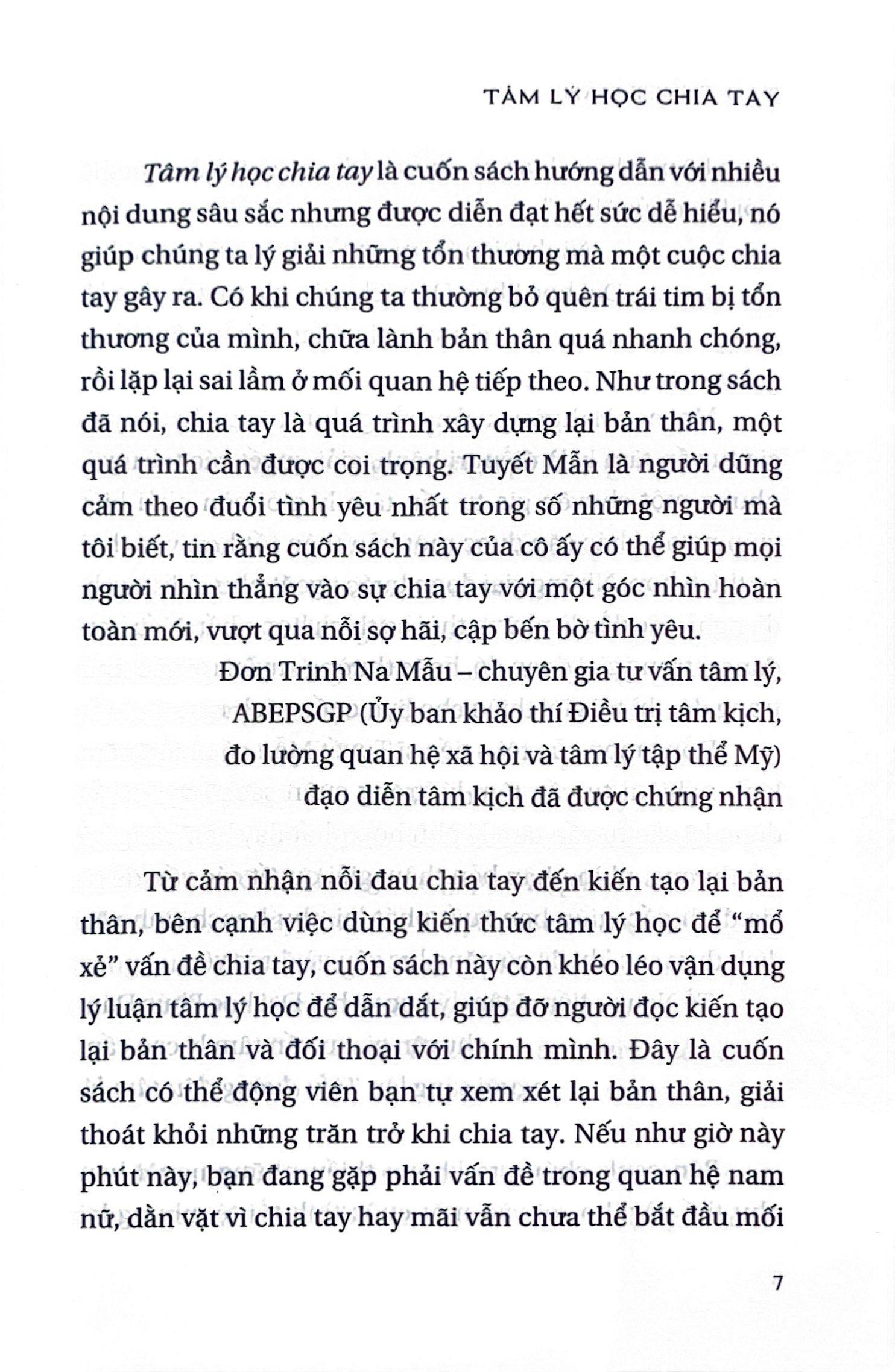Tâm Lý Học Chia Tay Sau chia tay, ngoại tình, bạo hành, tranh cã làm sao để vượt qua thời kỳ đen tối, tái tạo bản thân? Cuốn sách này sẽ chữa lành bạn bằng lý trí, cung cấp cho bạn những kiến thức khoa học thần kinh liên quan, từng bước chỉ bạn cách nhìn nhận lại bản thân, người cũ cũng như mối quan hệ cũ, tránh cho bạn lý giải sai lầm dẫn đến xử lý sai lầm, cổ vũ bạn sống thật với chính m.ình, dũng cảm mưu cầu một tình yêu thân mật và dài lâu. Chia tay không phải là thảm họa, chia tay chính là thời cơ ngàn năm có một để bạn thêm trưởng thành.