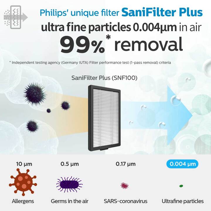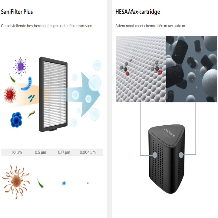 - Tấm lọc SaniFiler Plus lọc 3 giai đoạn mạnh mẽ độc đáo loại bỏ tới 125 chất gây ô nhiễm có hại và khí thải và các loại virut, thông qua các lớp HEPA và HESA. Được chứng nhận độc lập bởi Airmid Healthgroup, công nghệ SaniFilter Plus cũng loại bỏ tới 99% các hạt bụi siêu mịn và các chất gây dị ứng trong xe. Lọc hiệu quả các hạt nhỏ đến 0,004um, bao gồm các loại vi rút và vi khuẩn tức là nhỏ hơn 40 lần so với Virut SARS-Corona, nhỏ hơn 100 lần so với các loại virut thông thường .