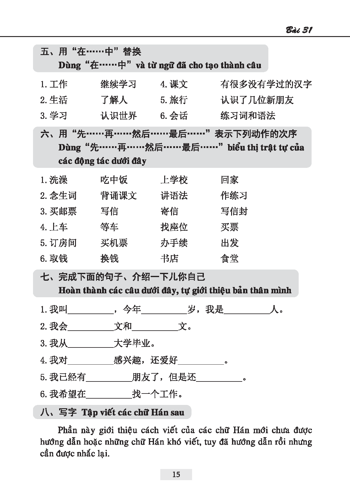 Giáo Trình Hán Ngữ Boya - Sơ Cấp Tập 2 (Sách Bài Tập Kèm Đáp Án) Cuốn sách tiếng Trung thuộc trình độ sơ cấp giúp người học tăng vốn từ vựng và ngữ pháp một cách nhanh chóng Ở Việt Nam hiện nay, tiếng Trung là một trong bốn ngoại ngữ phổ biến nhất. Số lượng người học tiếng Trung tăng qua từng ngày, bởi đây là môn ngoại ngữ giúp người học mở ra nhiều cơ hội cả trong học tập lẫn công việc. Bạn đang là học sinh, sinh viên muốn học thêm tiếng Trung để nâng cao tầm hiểu biết cũng như phục vụ cho học tập Bạn muốn nhập hàng từ Trung Quốc để kinh doanh nhưng lại không biết tiếng Trung nên mất rất nhiều chi phí cho trung gian Bạn muốn học tiếng Trung để phục vụ cho công việc Vấn đề của các bạn là: Bạn là người mới bắt đầu học tiếng Trung, bạn không biết nên tự học, tự ôn luyện ở nhà như thế nào? Ngữ pháp và Vốn từ vựng của bạn bị hạn chế, làm sao để nâng cao cả 2 yếu tố này? Kỹ năng đọc và viết rất quan trọng và cần được cải thiện nhưng đây lại là 2 kỹ năng khó và các bạn chưa biết nên cải thiện 2 kỹ năng này như thế nào? Nếu câu trả lời của bạn cho 3 vấn đề trên vẫn là KHÔNG hoặc CHƯA thì bộ giáo trình Hán ngữ Boya sơ cấp chính là giải pháp tốt nhất dành cho các bạn. Thông qua tập 1 các bạn đã được 30 bài đầu của trình độ sơ cấp. Tập 2 sẽ cung cấp cho các bạn 25 bài còn lại của trình độ này. Vì sao cuốn giáo trình tiếng Trung này có thể giải quyết hết những vấn đề của bạn? Trình bày khoa học, chi tiết phù hợp cho việc tự học, tự ôn tập sau những giờ học trên lớp Mỗi bài học chia ra các đơn nguyên. Mỗi đơn nguyên bao gồm các bài. Trước đơn nguyên có phần luyện, sau đơn nguyên là bài tập. Hoạt động luyện tập đơn nguyên có hình thức đa dạng, mục đích là giúp học sinh nhớ lại tri thức ngôn ngữ đã có hoặc chuẩn bị cho việc học đơn nguyên mới. Bài tập của các chủ đề gồm nhiều tầng kiến thức, từ kết cấu âm tiết chữ Hán, ngữ tố, từ hội cho đến các bài văn, giúp học sinh củng cố, hấp thu và vận dụng kết cấu ngôn ngữ của chủ đề. Phần cuối mỗi chủ đề đều có bài đọc và viết bài tập. Bài đọc tái hiện từ hội và điểm ngôn ngữ trong mỗi chủ đề. Chủ yếu là luyện tập năng lực viết bài cho học sinh, ngoài ra còn luyện cho học sinh kỹ năng ứng dụng kết cấu ngôn ngữ trong mỗi chủ đề. Với cách trình bày này các bạn hoàn toàn có thể tự học, tự ôn luyện sau những giờ lên lớp mà vẫn hiệu quả. Luyện tập nhiều cấu trúc ngữ pháp và từ vựng từ đó tăng khả năng đọc, viết của người học Trọng tâm của cuốn sách là công năng huấn luyện ngôn ngữ và tuyển chọn ngữ liệu tự nhiên xoay quanh sự hứng thú của người học. Từng bài học các bạn sẽ được ôn luyện từ vựng cùng các ngữ pháp trọng điểm. Qua phần lý thuyết các bạn sẽ được làm các bài tập liên quan tới phần lý thuyết vừa học nhằm củng cố và nâng cao kiến thức nhanh chóng. Mỗi bài học các bạn sẽ được hệ thống lại khoảng 20 từ vựng với phiên âm pinyin giúp các bạn có thể đọc được chữ Hán. Qua cách trình bày này các bạn sẽ tăng được khả năng đọc cũng như khả năng sử dụng văn phong linh hoạt. Cung cấp các bài tập luyện viết bám sát từng bài học Phần luyện viết giúp các bạn luyện tập các từ vựng theo từng bài học với nhiều dạng bài tập. Người học sẽ được làm các dạng bài như: Viết phiên âm từ vựng, điền từ vào chỗ trống, viết đoạn văn, luyện viết theo mẫu,… Hệ thống các bài tập này chính là nguồn tài liệu để các bạn ôn luyện cho các bài kiểm tra, bài thi. Phần luyện viết có sẵn các nét mờ, những chữ đầu bạn có thể tô lại để quen nét chữ và thứ tự các nét, từ đó tạo thói quen để tự viết những chữ sau.