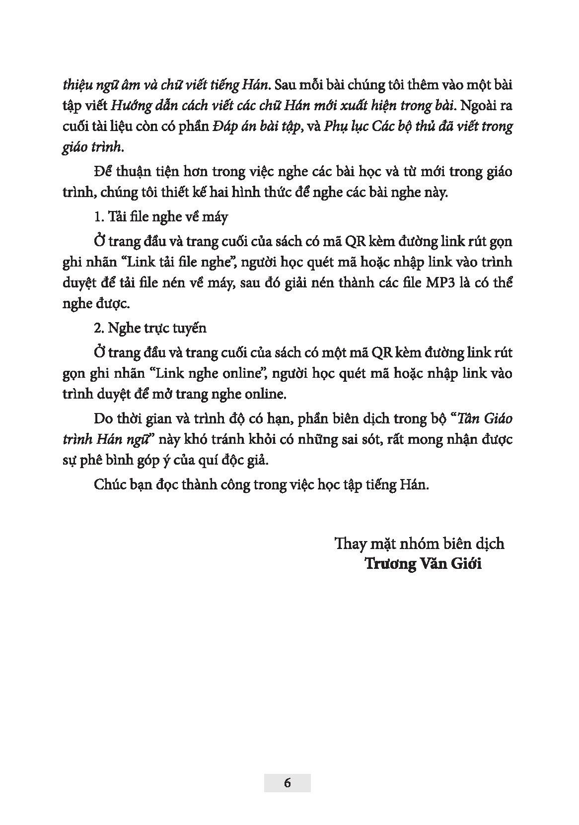 • Nghe trực tuyến        Ở trang đầu và trang cuối của sách có một mã QR kèm đường link rút gọn ghi nhãn “Link nghe online”, người học quét mã hoặc nhập link vào trình duyệt để mở trang nghe online.        Do thời gian và trình độ có hạn, phần biên dịch trong bộ “Tân Giáo trình Hán ngữ” này khó tránh khỏi có những sai sót, rất mong nhận được sự phê bình, góp ý của quý độc giả.