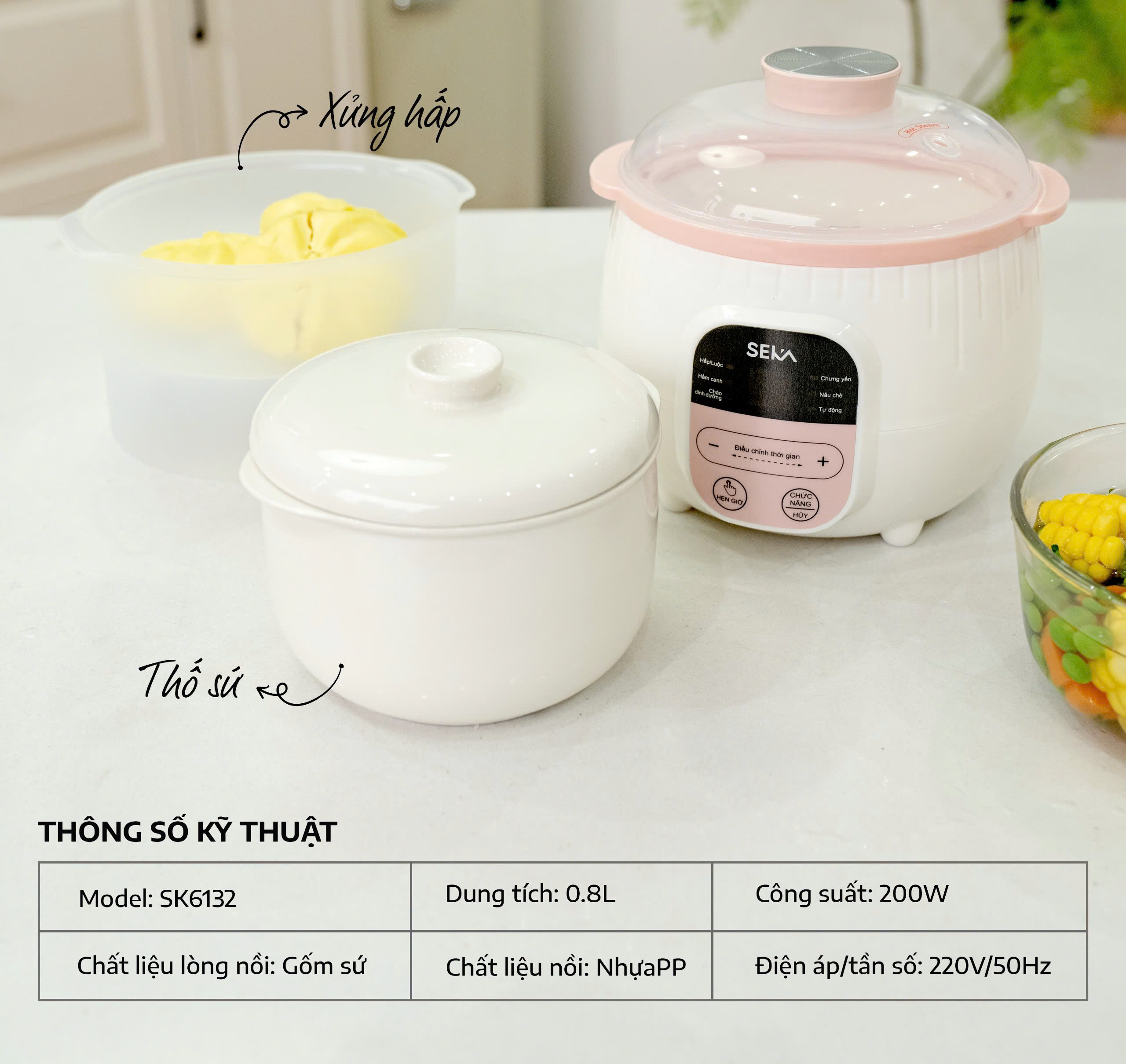 Nồi Nấu Cháo Chậm Seka 0.8L Nồi Chưng Yến Cách Thuỷ Nồi Nấu Cháo Cho Bé Nồi nấu chậm Seka SK6132 là thiết bị nhà bếp thông minh, được tích hợp đến 6 chế độ