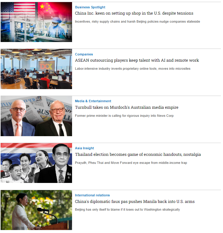Nikkei Asia là tạp chí tiếng Anh có tên tuổi thuộc tập đoàn Nikkei - Nhật Bản, chuyên viết về những xu hướng kinh tế, công nghệ, chính trị của các nước trong khu vực
