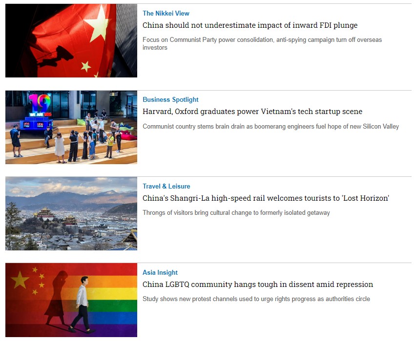 Nikkei Asia là tạp chí tiếng Anh có tên tuổi thuộc tập đoàn Nikkei - Nhật Bản, chuyên viết về những xu hướng kinh tế, công nghệ, chính trị của các nước trong khu vực