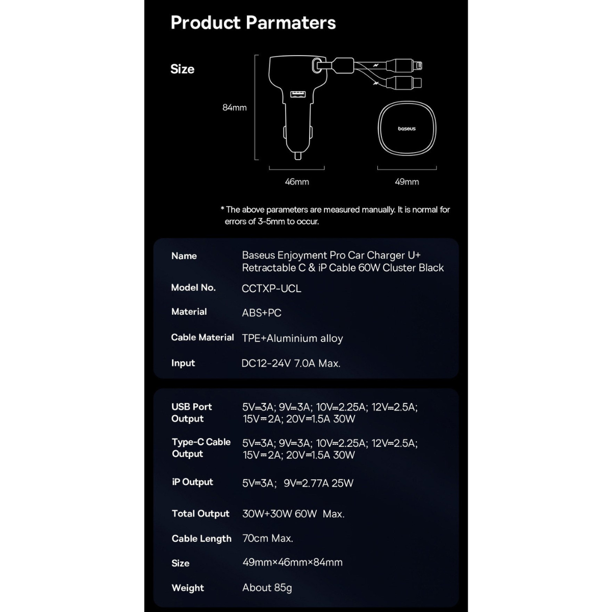 Giới thiệu Tẩu sạc dùng trên ô tô tích hợp cáp Type C và Light-ning Cable 60W Baseus Enjoyment Pro Car Charger - Thương hiệu: Baseus - Chất liệu: ABS+PC, TPE+Aluminium alloy - Input: DC 12-24V 7.0A Max.