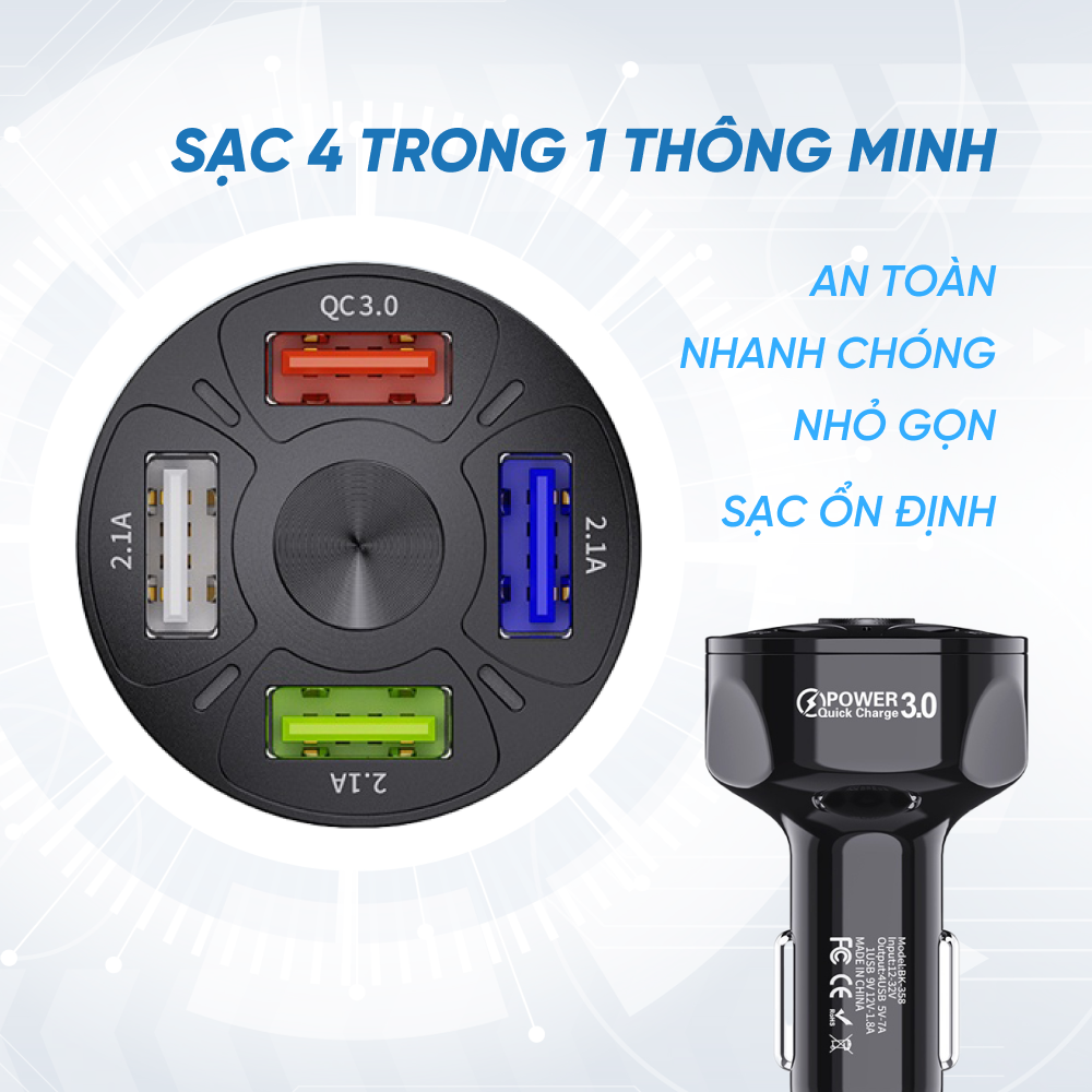 Mua tại TiktokTẩu Sạc Xe Ô Tô 4 Cổng USB Công Nghệ Sạc Nhanh QC 3.0A THÔNG TIN SẢN PHẨM: