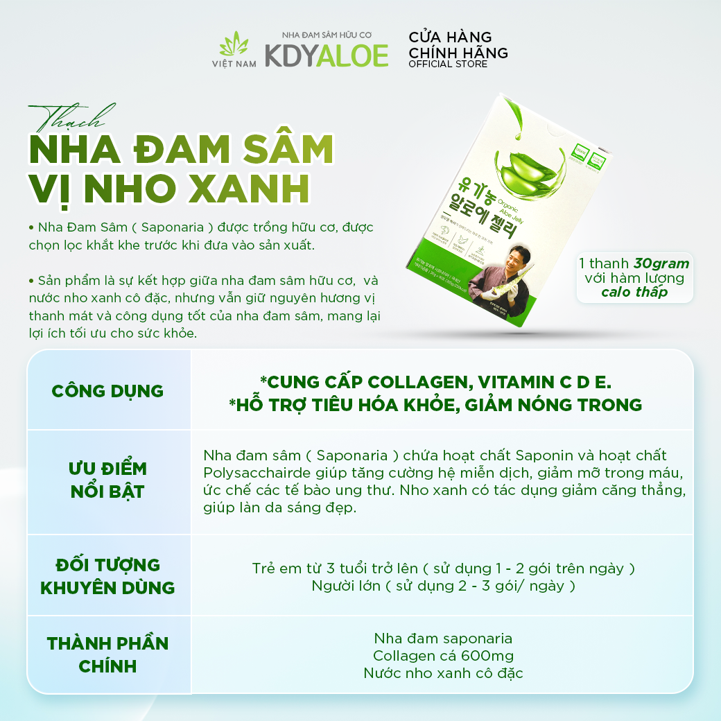 Thạch collagen nha đam sâm nho xanh hữu cơ hỗ trợ đẹp da. * Thương hiệu: KDY Aloe * Xuất xứ: Hàn Quốc * Quy cách: 30 gói/set * Dung tích: 30g/ gói * Dạng: