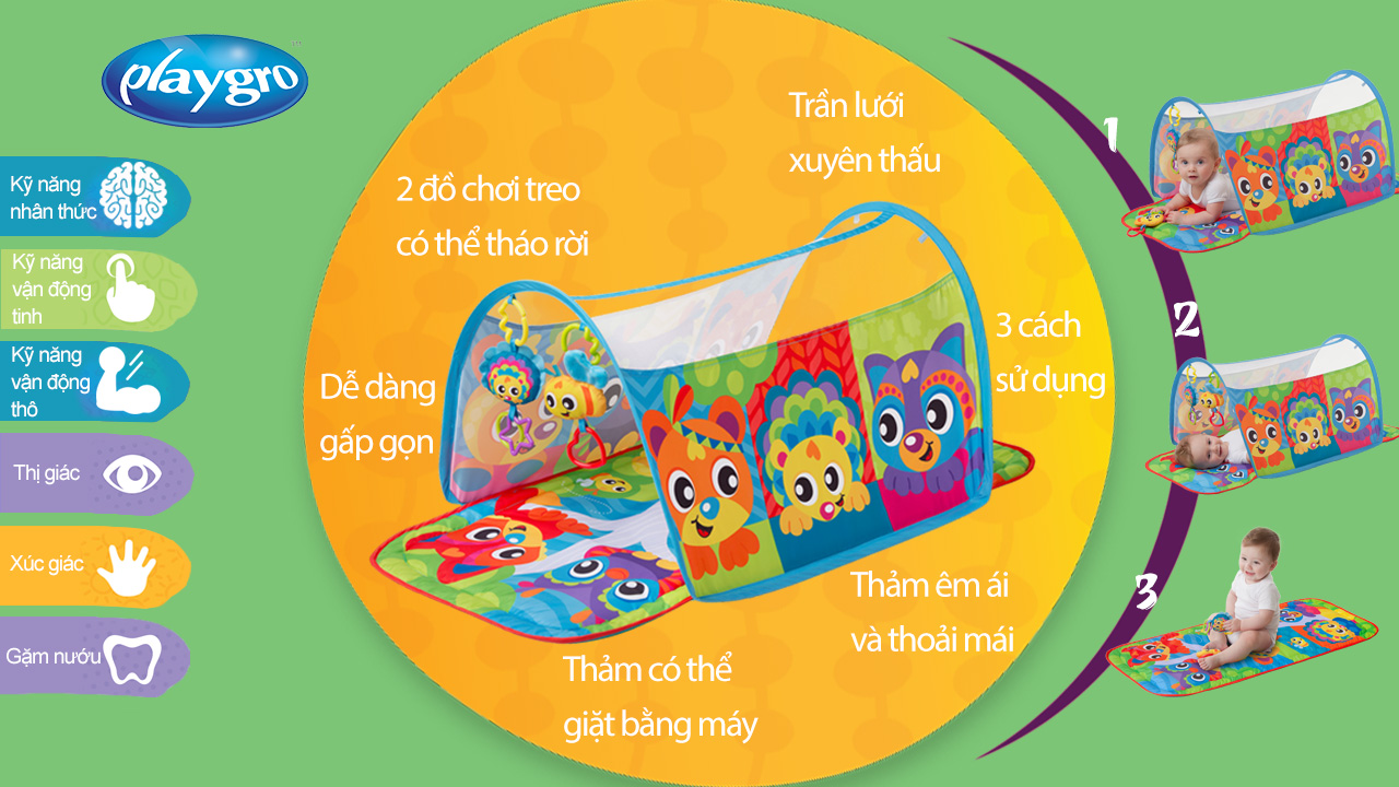 Đặc điểm Thảm chơi đường hầm Playgro Honey Bee Bear Activity Tunnel Gym: