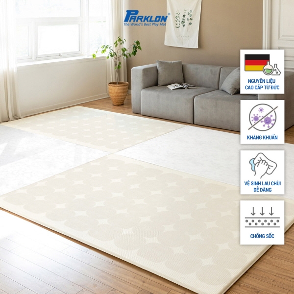 Mua tại TiktokThảm Trẻ Em Hàng Đầu Thế Giới Nhập Khẩu Chính Hãng Hàn Quốc Parklon Thương hiệu: Parklon Xuất xứ: Hàn Quốc Chất liệu: Nhựa PVC Họa tiết: Milo Beige / Màu Be Trơn Kích thước: 190cm x 130cm x 1.2cm Độ bền: 10 năm Sau thời gian tung tăng, bé yêu dễ dàng xếp gọn chiếc thảm và cất đi. Trọng lượng thảm chỉ 200g vô cùng nhẹ nhàng. Bề mặt của thảm chống trơn trượt, không bám bẩn và hoàn toàn không thấm nước nên có thể dễ dàng làm sạch với khăn ướt. Giữ không gian sạch sẽ và an toàn cho các bé. Lỡ tung tăng quá đà, ngã cũng không sao. Độ dày của thảm lên đến 1,2 cm, độ ma sát cao và cực kỳ êm ái. Bảo vệ trẻ khỏi những tổn thương do té ngã. Ngoài ra, nhờ độ êm ái, thảm làm giảm 50% tiếng ồn từ các tác động lên mặt sàn. Giúp các bé có thể vui chơi thỏa thích. THẢM TRẺ EM HÀNG DẦU THẾ GIỚI CHÍNH HÃNG PARKLON: Bảo vệ con bạn khỏi sàn nhà cứng khi các bé tập bò, tập đứng hay tập đi. Thảm trẻ em Parklon được thiết kế đặc biệt để hấp thụ tác động và mang lại sự thoải mái hàng giờ cho các bé. ★ Chất liệu cao cấp được nhập khẩu từ Đức, kết hợp với công nghệ tiên tiến nhất của Parklon để tạo nên những chiếc thảm trẻ em hoàn hảo nhất. ★ Công nghệ chống sốc, chống va đập và giảm tiếng ồn được cải tiến giúp trẻ thoải mái vui chơi. ★ Thiết kế 2 mặt với hoa văn đặc biệt chống trơn trượt và công nghệ bo góc đặc biệt không gây nguy hiểm cho bé. ★ Công nghệ Nano kháng khuẩn quanh năm, không gây dị ứng, an toàn ngay cả với làn da của trẻ sơ sinh. ★ Khả năng chống nước 100% và dễ dàng vệ sinh, chỉ cần lau sạch vết bẩn bằng khăn. ★ Bề mặt thảm mềm mại, êm ái kết hợ cùng chất liệu đặc biệt giúp giữ ấm vào mùa đông, không nóng vào mùa hè. ★ Chất liệu thân thiện với môi trường, không chứa các chất độc hại và kim loại nặng. ★ Đạt chứng nhận an toàn từ tổ chức toàn cầu: KC, SGS, ISO 9001, An toàn Châu Âu EN71