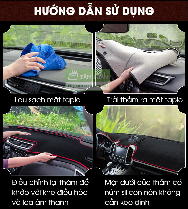Đặc điểm: Chất liệu da cao cấp, Có đế chống trượt, Màu da vân các bon đen mịn màng Chất Thảm chống nắng taplo Da lượng như hình