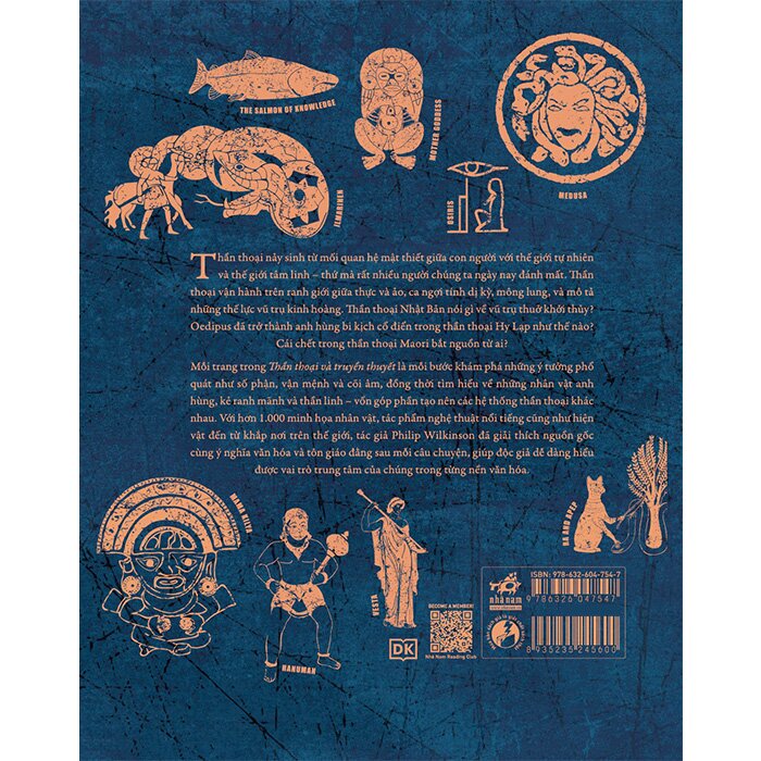 Thần Thoại Và Truyền Thuyết (Bìa Cứng) Thần thoại nảy sinh từ mối quan hệ mật thiết giữa con người với thế giới tự nhiên và thế giới tâm linh - thứ mà rất nhiều người chúng ta ngày nay đánh mất. Thần thoại vận hành trên ranh giới giữa thực và ảo, ca ngợi tính dị kỳ, mông lung, và mô tả những thế lực vũ trụ kinh hoàng. Thần thoại Nhật Bản nói gì về vũ trụ thuở khởi thủy? Oedipus đã trở thành anh hùng bi kịch cổ điển trong thần thoại Hy Lạp như thế nào? Cái chết trong thần thoại Maori bắt nguồn từ ai? Mỗi trang trong Thần thoại và truyền thuyết là mỗi bước khám phá những ý tưởng phổ quát như số phận, vận mệnh và cõi âm, đồng thời tìm hiểu về những nhân vật anh hùng, kẻ ranh mãnh và thần linh - vốn góp phần tạo nên các hệ thống thần thoại khác nhau. Với hơn 1.000 minh họa nhân vật, tác phẩm nghệ thuật nổi tiếng cũng như hiện vật đến từ khắp nơi trên thế giới, tác giả Philip Wilkinson đã giải thích nguồn gốc cùng ý nghĩa văn hóa và tôn giáo đằng sau mỗi câu chuyện, giúp độc giả dễ dàng hiểu được vai trò trung tâm của chúng trong từng nền văn hóa.