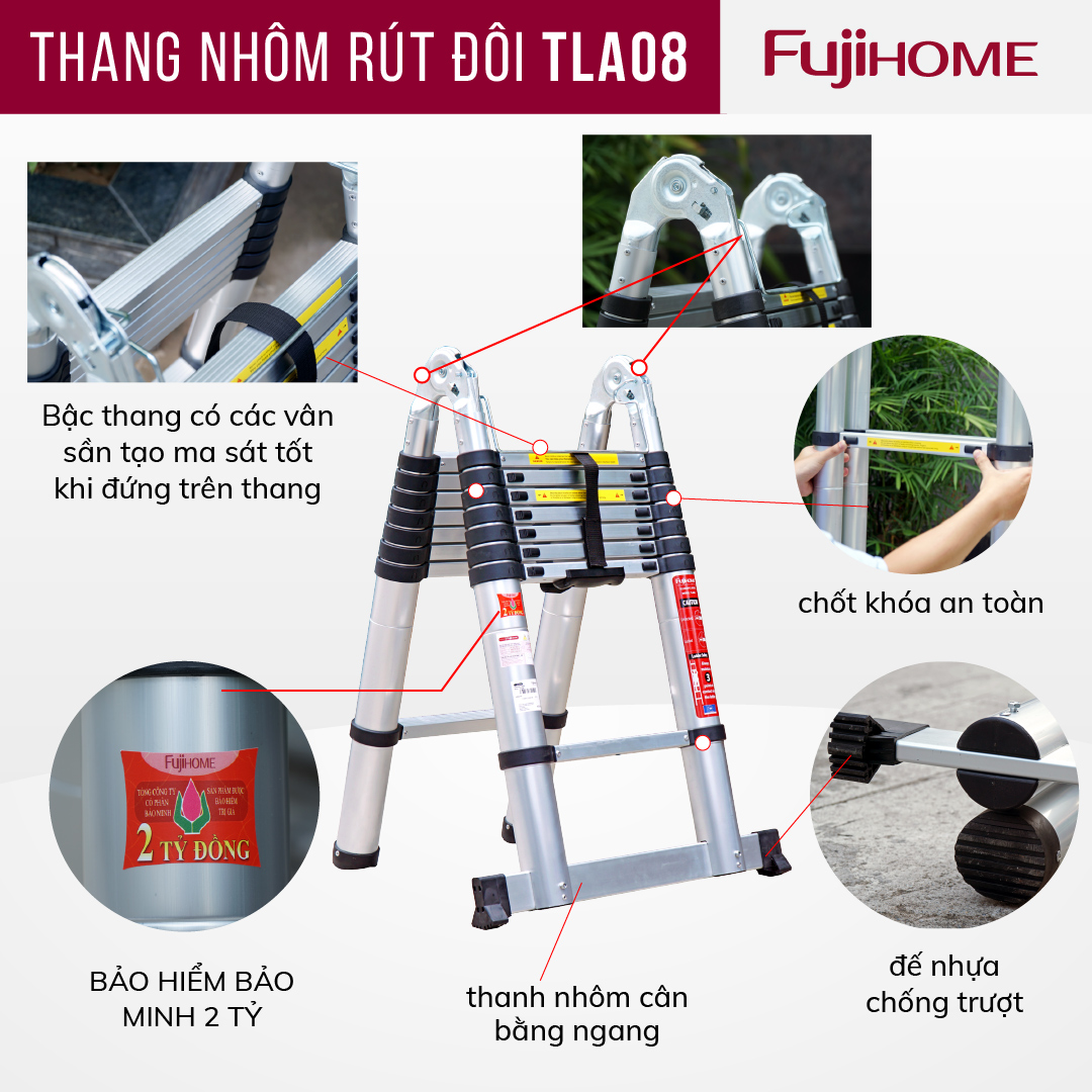 - Thang nhôm rút gọn (chữ A) FUJIHOME TLA08 là loại thang rút đa năng có thể dựng chữ A cho người sử dụng đứng mà không cần có điểm dựa vào, ngoài ra thang còn có thể dựng đứng lên chữ I với chiều cao gấp đôi so với chữ A.