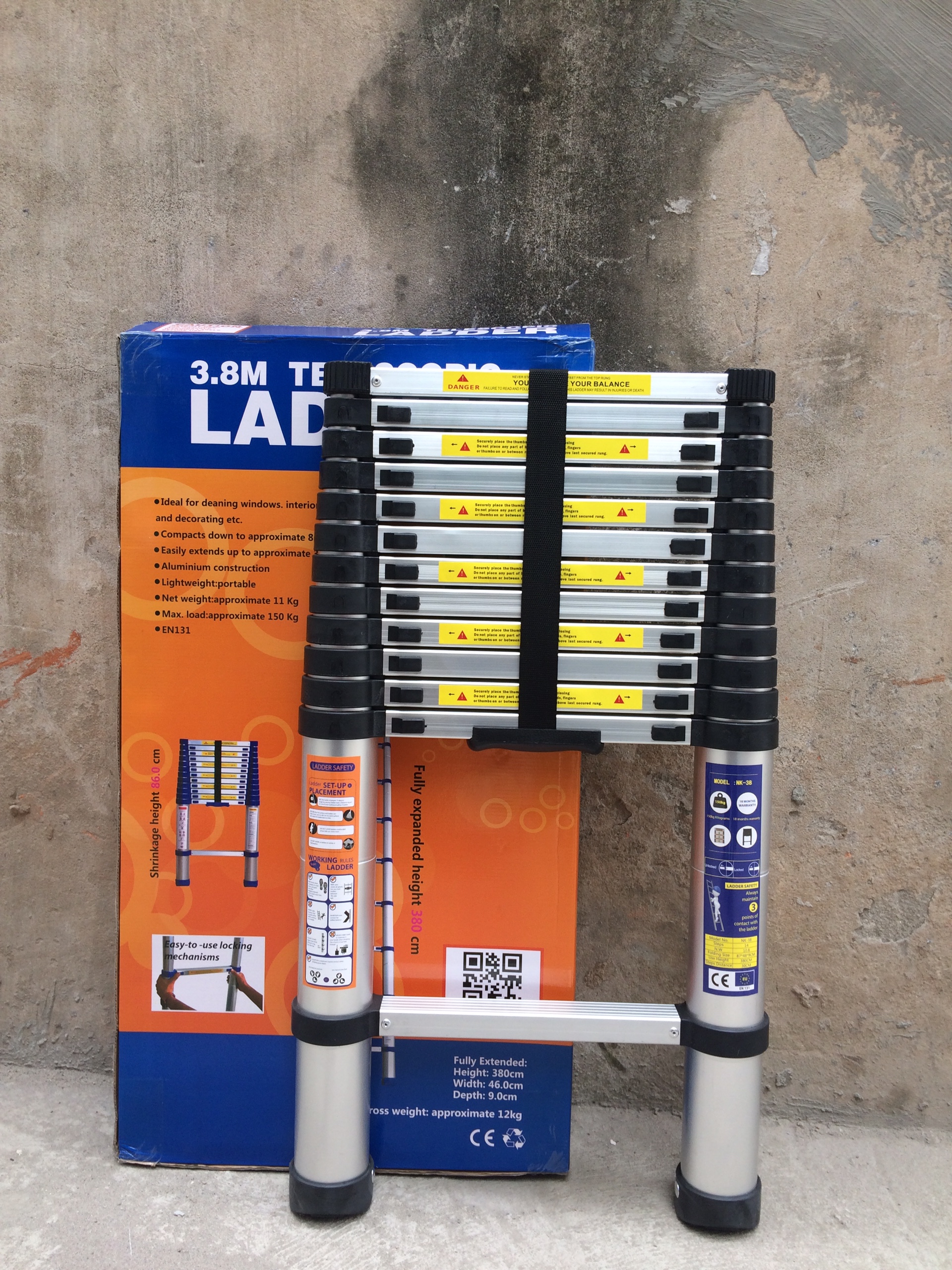 Thương hiệu: Ninda. - Mã sản phẩm: NK-54 - Chiều cao tối đa: 5m4 - Chiều cao rút gọn: 1m1 - Kích thước đóng hộp: 112x50x10cm - Chất liệu: Hợp kim nhôm - Độ dày