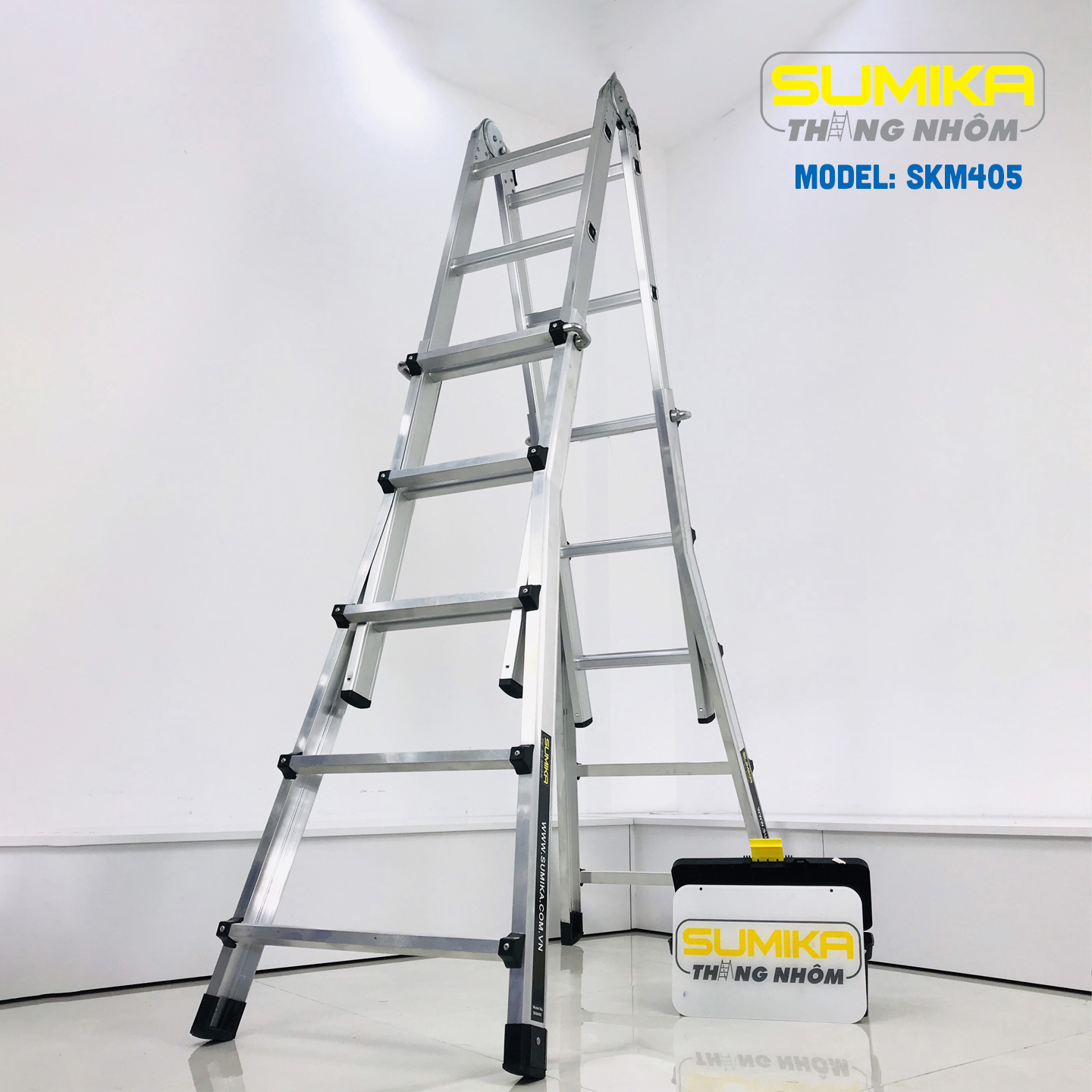 - SKM405 là sự tổng hợp của thang chữ A, thang nhôm rút gọn và thang trượt. Ưu điểm lớn của loại thang này chính là có thể sử dụng giữa các bậc thang (cải tiến nhược điểm của thang chữ A).