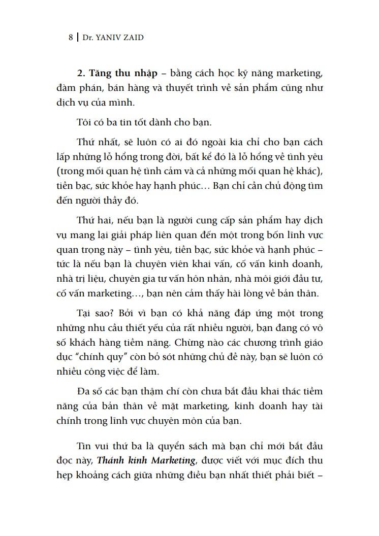 Có thể thấy “Thánh kinh marketing” không phải là một quyển sách hướng dẫn làm marketing thông thường, mà là một công cụ giúp người đọc điều chỉnh góc nhìn và cách tiếp cận hoạt động marketing cũng như bán hàng trong thời đại kỹ thuật số. Chẳng hạn, bạn có thể nắm bắt được chiến thuật bán hàng tinh tế mà trong đó “bạn phát triển một cuộc trò chuyện với khách hàng và qua đó, bạn kín đáo chia sẻ cho khách hàng về những lợi ích của sản phẩm hay dịch vụ của bạn”. Hoặc bạn cũng có thể nắm vững nguyên tắc “sự hờ hững có lý trí” trong kinh tế học… Trong “Thánh kinh marketing”, Yaniv Zaid sẽ mang đến cho độc giả những ý tưởng hữu ích và phương pháp hiệu quả để giải phóng tiềm năng sáng tạo của chính m.ình và hướng tới thành tích tối ưu cho hoạt động kinh doanh.