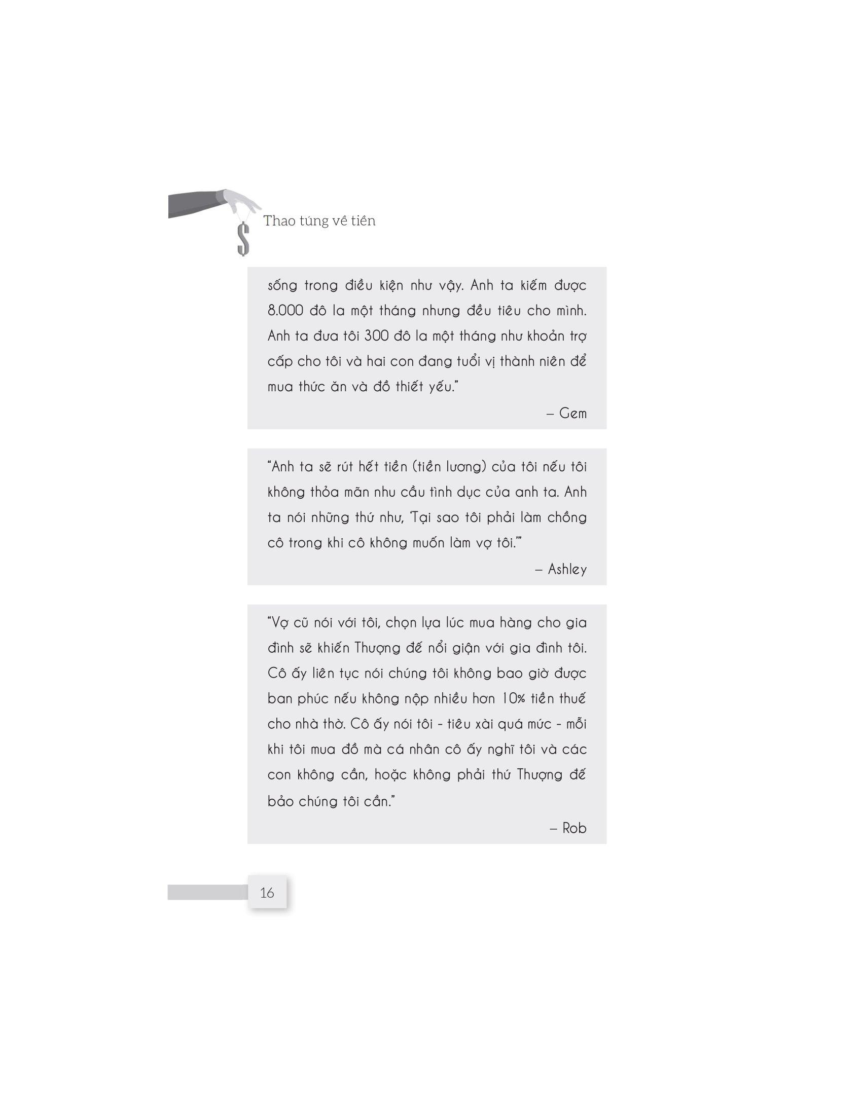 Cuốn sách “Thao túng về tiền” sẽ cho bạn cơ hội vén tấm màn che đậy và thấy được cuộc sống của những người bị tổn hại tài chính do những người thân thiết với họ gây ra. Nó cũng giúp bạn có được cái nhìn cụ thể và sâu sắc hơn về lạm dụng tài chính để nhận biết sớm, có hành động dứt khoát giúp bạn thoát khỏi hố sâu tâm lý và chữa lành những tổn thương tiềm ẩn.