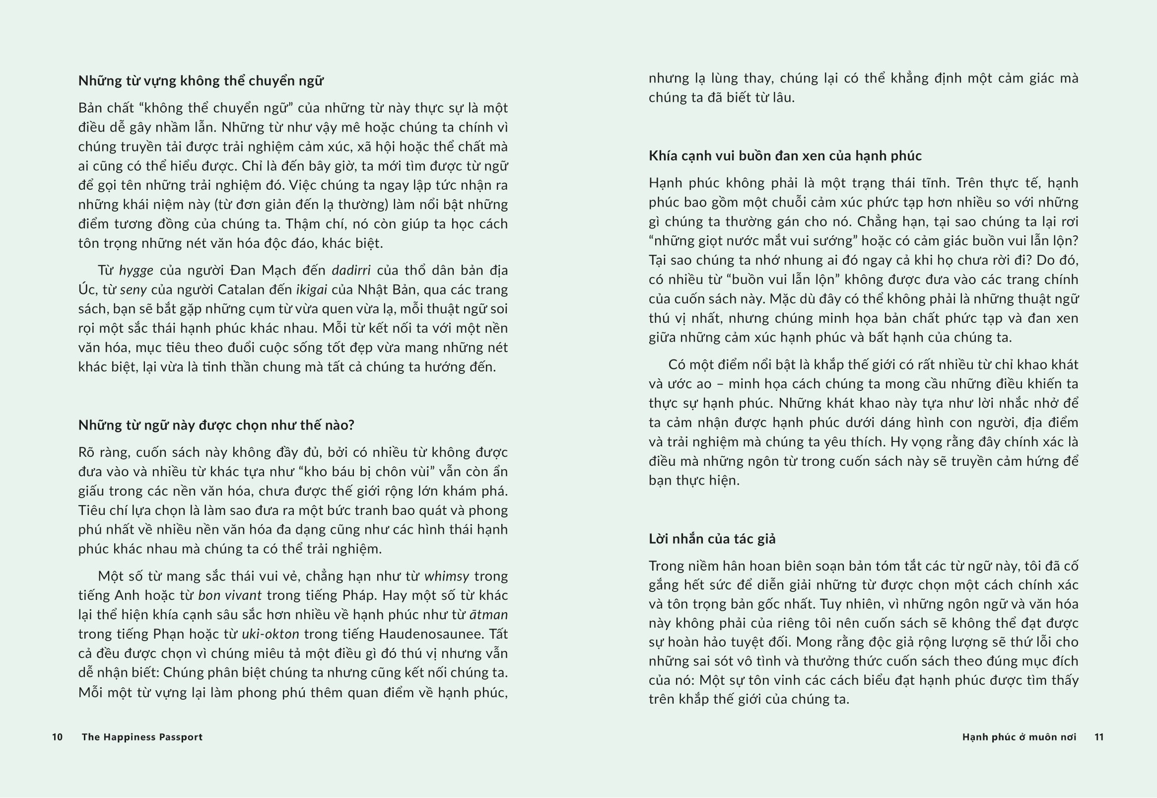 The Happiness Passport - Hành Trình Tìm Kiếm Niềm Vui Qua 50 Từ Kỳ Diệu GIỚI THIỆU SÁCH: The Happiness Passport là một “công trình” nghiên cứu của nhà văn, học giả Megan C. Hayes, đào sâu vào kho tàng các cách biểu đạt về hạnh phúc tại hơn 200 quốc gia trên thế giới. Mỗi cách biểu đạt đại diện cho từng nét văn hóa độc đáo của nơi chúng xuất phát, gợi biết bao tò mò nhưng lạ lùng thay lại khẳng định một cảm giác mà có thể bạn đã biết từ lâu. Là Meraki khi làm một điều gì đó bằng cả trái tim? Là Joie de vivre khi sống hết mình cho hiện tại? Hay đơn giản như Lagom khi biết chỉ đủ là an yên? Qua từng trang sách, bạn sẽ không chỉ thu thập thêm kiến thức về hay vốn từ vựng mới lạ độc đáo 1-0-2 mà còn học được những bí quyết để đạt được sự cân bằng, viên mãn trong cuộc sống từ các nền văn minh lâu đời trên thế giới. Dưới nét vẽ minh họa của Yelena Bryksenkova, hãy để cuốn sách dẫn dắt bạn đến vùng đất của những ngày tháng tươi đẹp vô bờ!