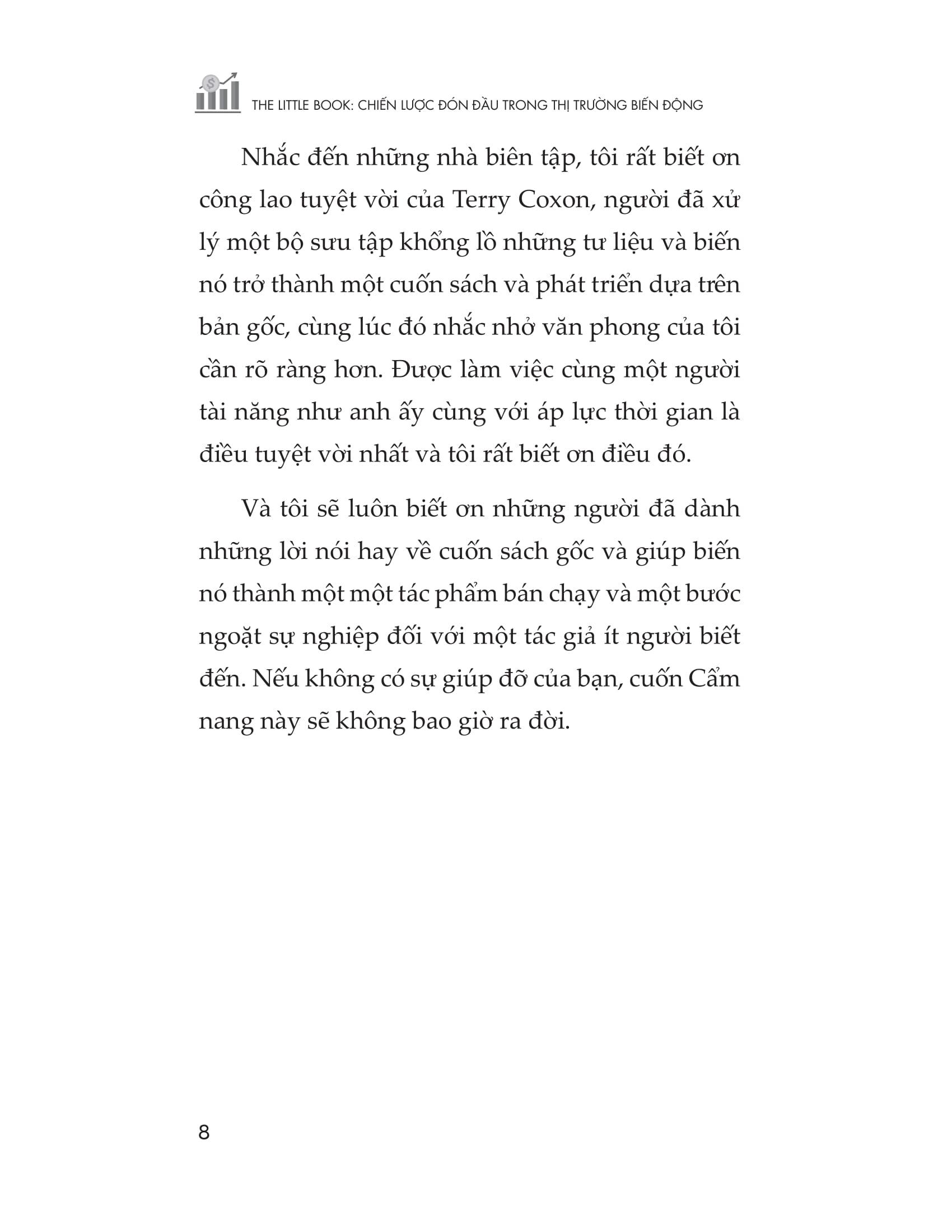 Đưa ra lộ trình thực tế về những gì đang diễn ra trên thị trường nhằm giúp bạn đón đầu xu hướng, cuốn sách đã vạch trần nhiều lầm tưởng chi phối logic đầu tư, đặc biệt là các phương tiện mua và giữ, mang lại lợi nhuận tương đối mà Phố Wall rao bán. Cung cấp cho bạn cái nhìn rõ ràng về các xu hướng đang định hình thị trường hiện nay, những xu hướng có khả năng cung cấp các lựa chọn đầu tư cho thập kỷ tới, “THE LITTLE BOOK: Chiến lược đón đầu trong thị trường biến động”dạy về giá trị của việc nghiên cứu cẩn thận trước khi bạn bỏ tiền ra đầu tư.