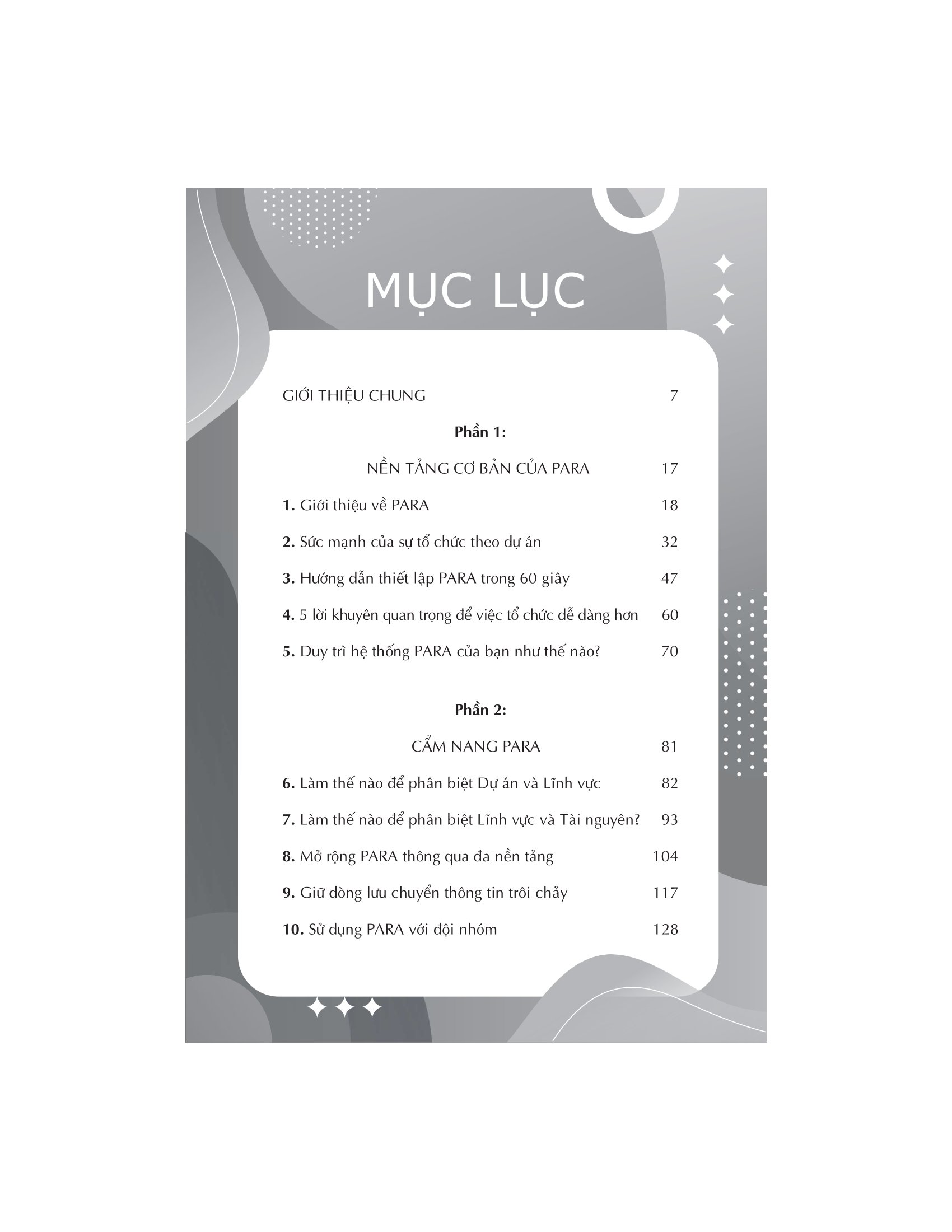 Cuộc sống hiện đại đòi hỏi phải xử lý rất nhiều thông tin. Nhưng chúng ta chưa bao giờ được dạy cách quản lý thông tin một cách hiệu quả để có thể tìm thấy thứ mình cần. Trong The PARA METHOD – Phương pháp tổ chức thông tin trong công việc, Tiago Forte phác thảo một hệ thống bốn bước đơn giản và trực quan sẽ giúp chúng ta sắp xếp tất cả thông tin tràn ngập trong não thành bốn loại chính. Theo đó PARA là từ viết tắt của “Projects” (Dự án), “Areas” (Lĩnh vực), “Resources” (Tài nguyên) và “Archives” (Lưu trữ).