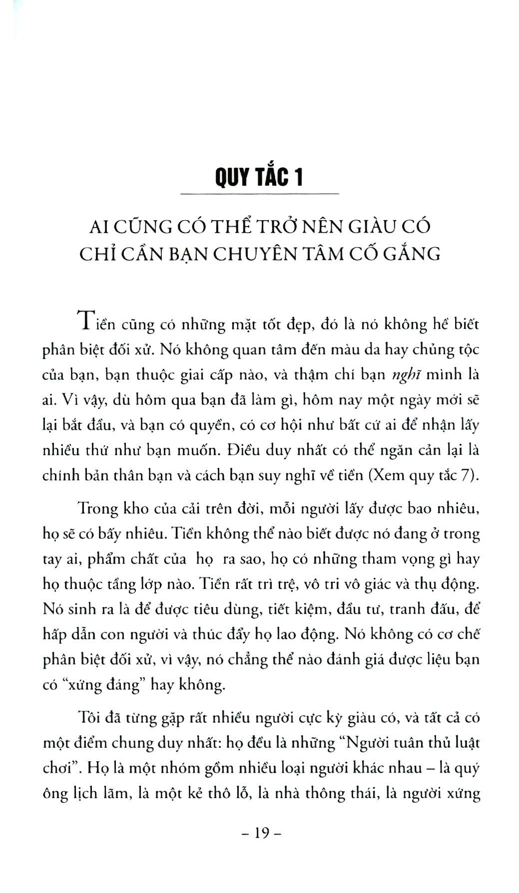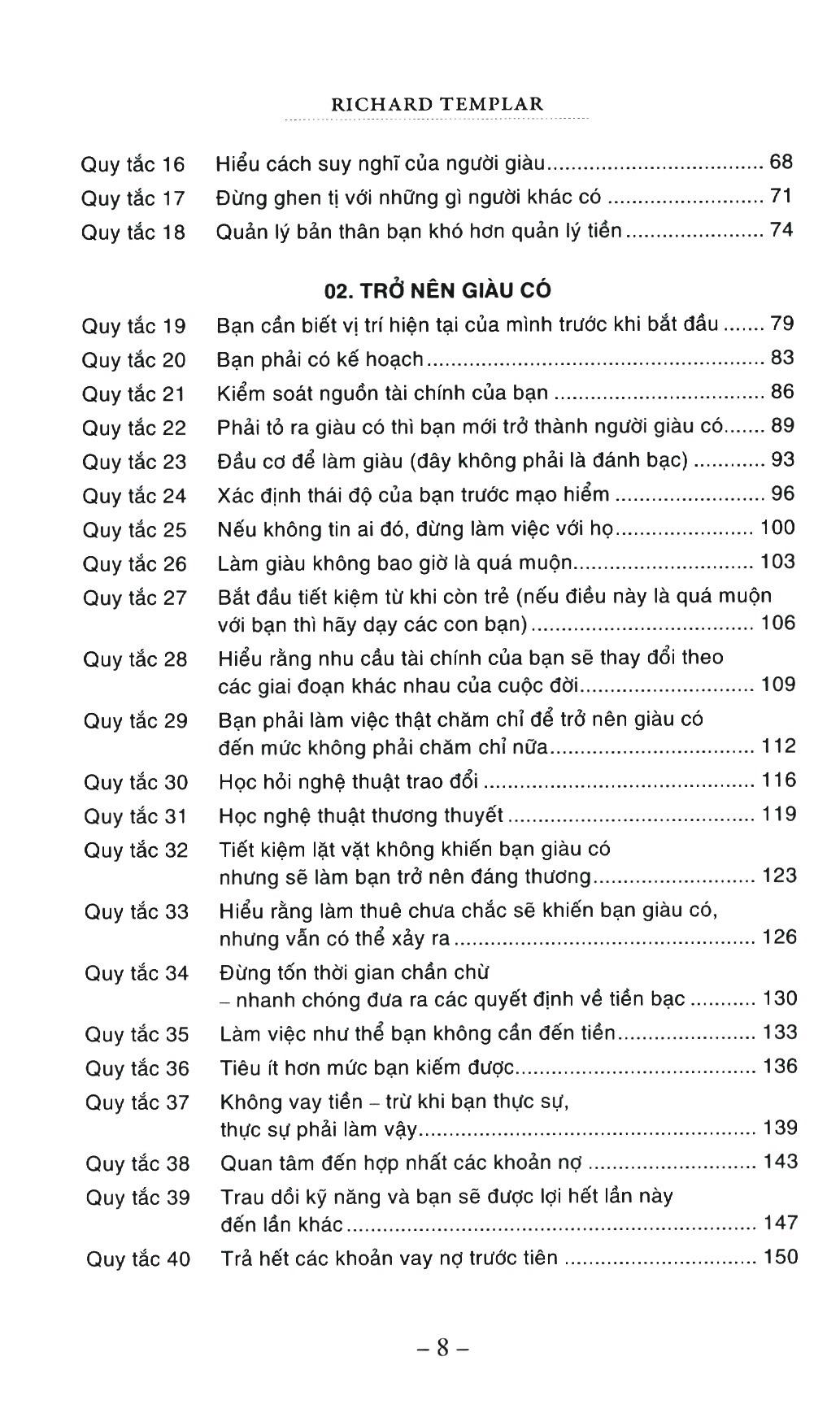 Giống như khi đi tìm kho báu, để khởi đầu hành trình đến đích giàu có, bạn cũng cần một tấm bản đồ chi tiết, chính xác. Những quy tắc để giàu có của tác giả Richard Templar chính là tấm bản đồ như thế. Trong cuốn sách này, Richard Templar sẽ dẫn dắt các bạn bắt đầu với suy nghĩ Giàu có để trở nên giàu có và giàu có hơn nữa rồi chia sẻ giàu có. Những quy tắc thiết thực, hữu ích, được đúc kết từ kinh nghiệm của rất nhiều người mà tác giả đưa ra sẽ giúp bạn ngày càng tiến gần đến đích. Hãy đọc, nghiền ngẫm kỹ từng quy tắc, và quan trọng nhất là hãy áp dụng chúng, bạn sẽ thấy điều kì diệu xảy ra.