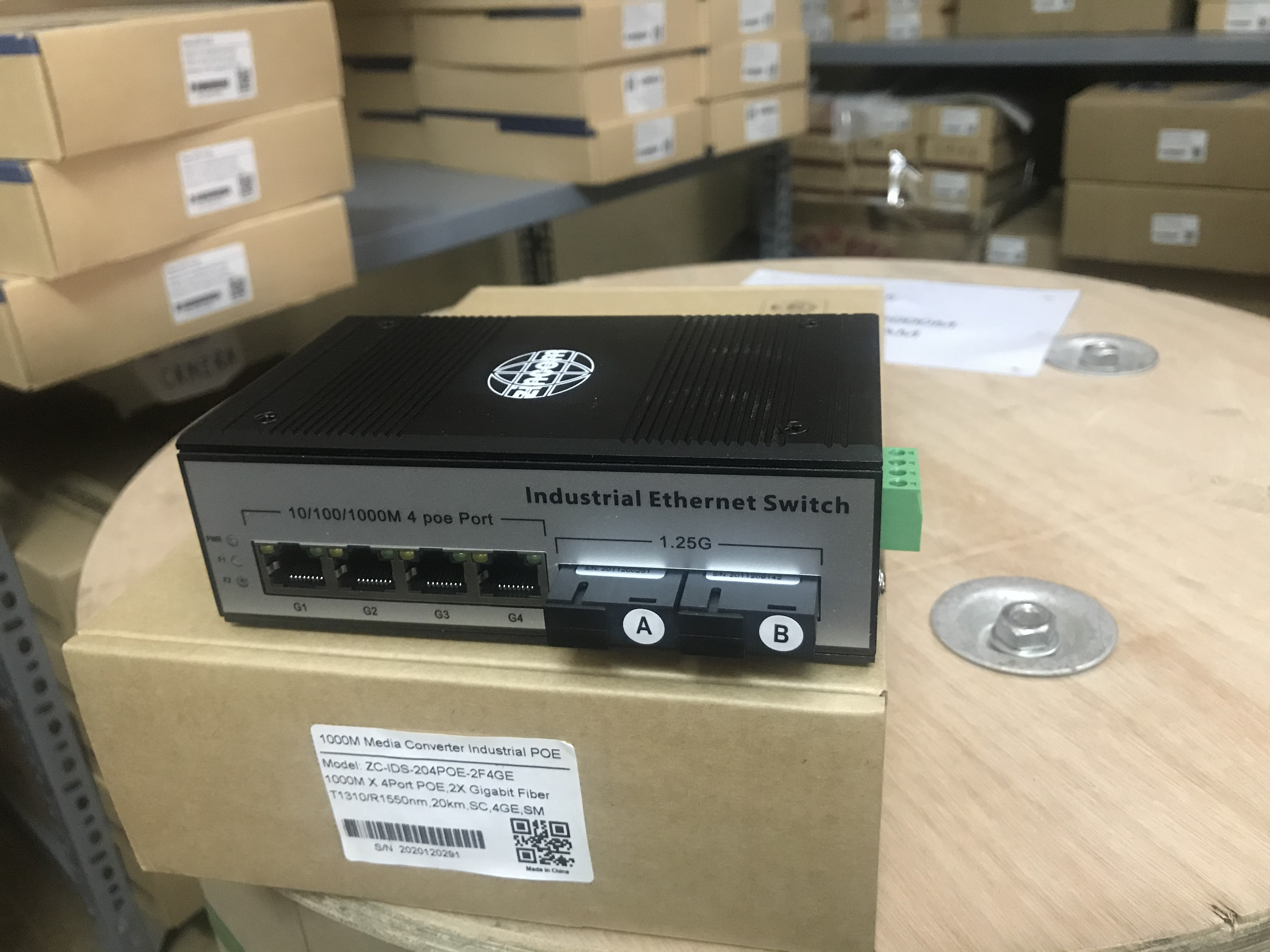 Thiết bị chuyển mạch công nghiệp, Switch POE công nghiệp . Model: ZC-POE402FIG. Hsx Zincom. Mới 100% - 4 Cổng lan POE tốc độ 10/100/1000Mbps - 2 cổng quang 1 sợi chuẩn SC AB, tốc