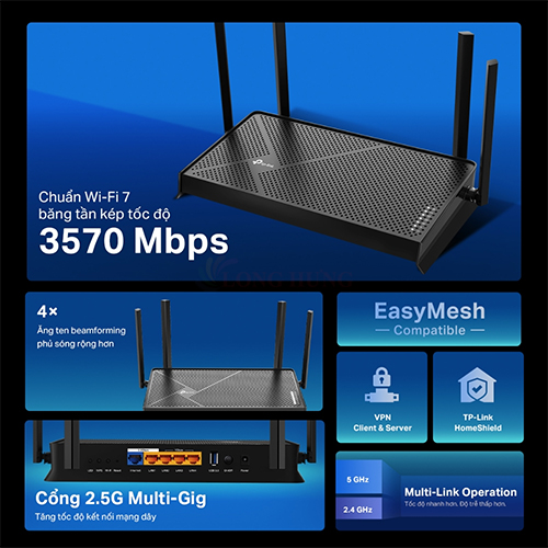 - Chuẩn Wi-Fi 7 tốc độ đến 3.6 Gbps - Băng tần kép 2.4GHz (688 Mbps) + 5GHz (2880 Mbps) - Multi-Link Operation (MLO) giảm độ trễ vượt trội - Công nghệ OFDMA & MU-MIMO tối ưu đa thiết bị - 2 ăng-ten hiệu suất cao phủ sóng rộng rãi - Cổng 2.5G + 1 cổng Gigabit tốc độ siêu nhanh - Bảo mật WPA3 chống truy cập trái phép - Quản lý qua ứng dụng TP-Link Tether - Hỗ trợ OneMesh mở rộng Wi-Fi liền mạch - Lý tưởng cho gaming, livestream, 4K/8K streaming LƯU Ý KHI MUA HÀNG Cảm ơn quý khách đã quan tâm đến sản