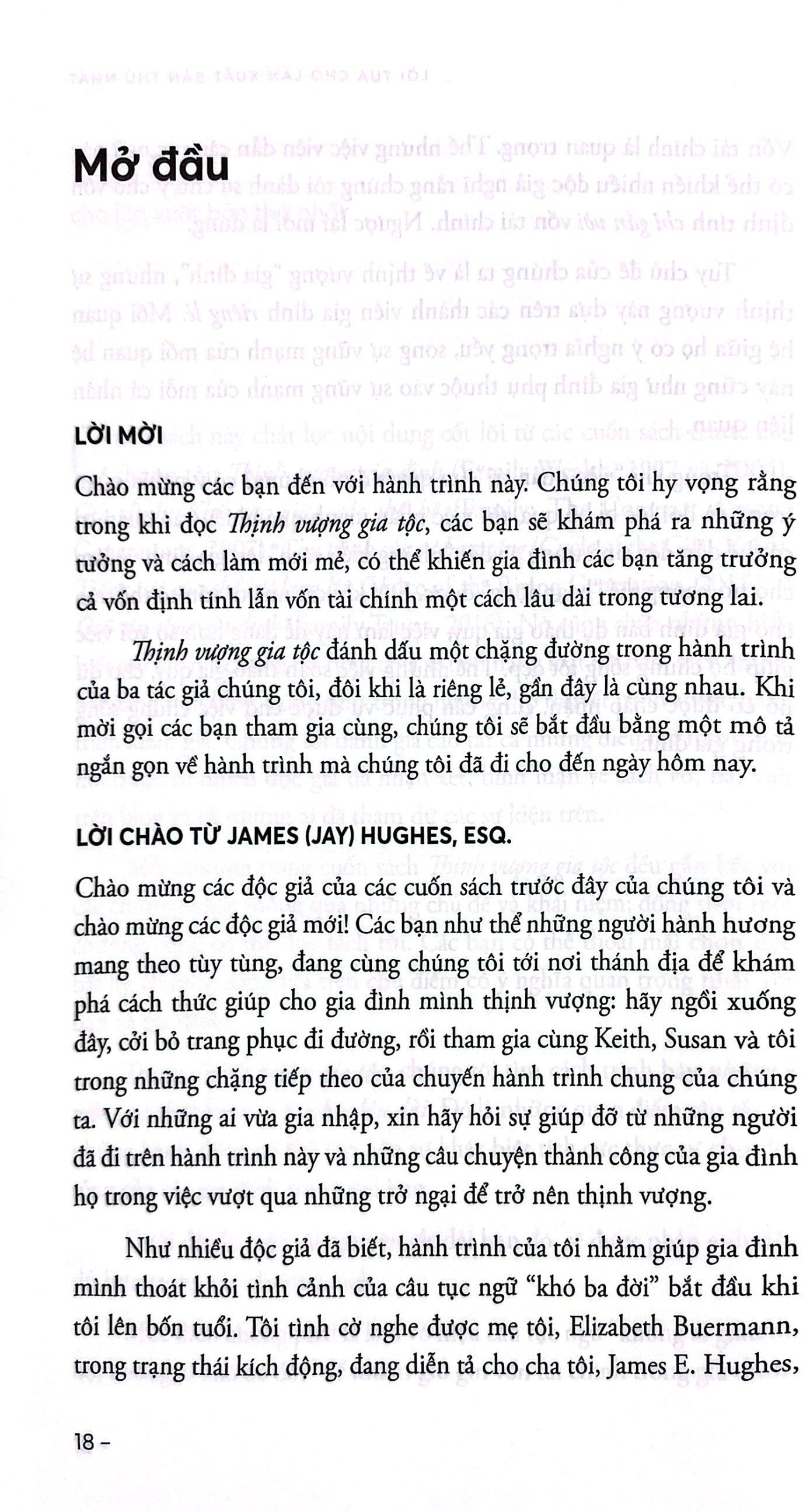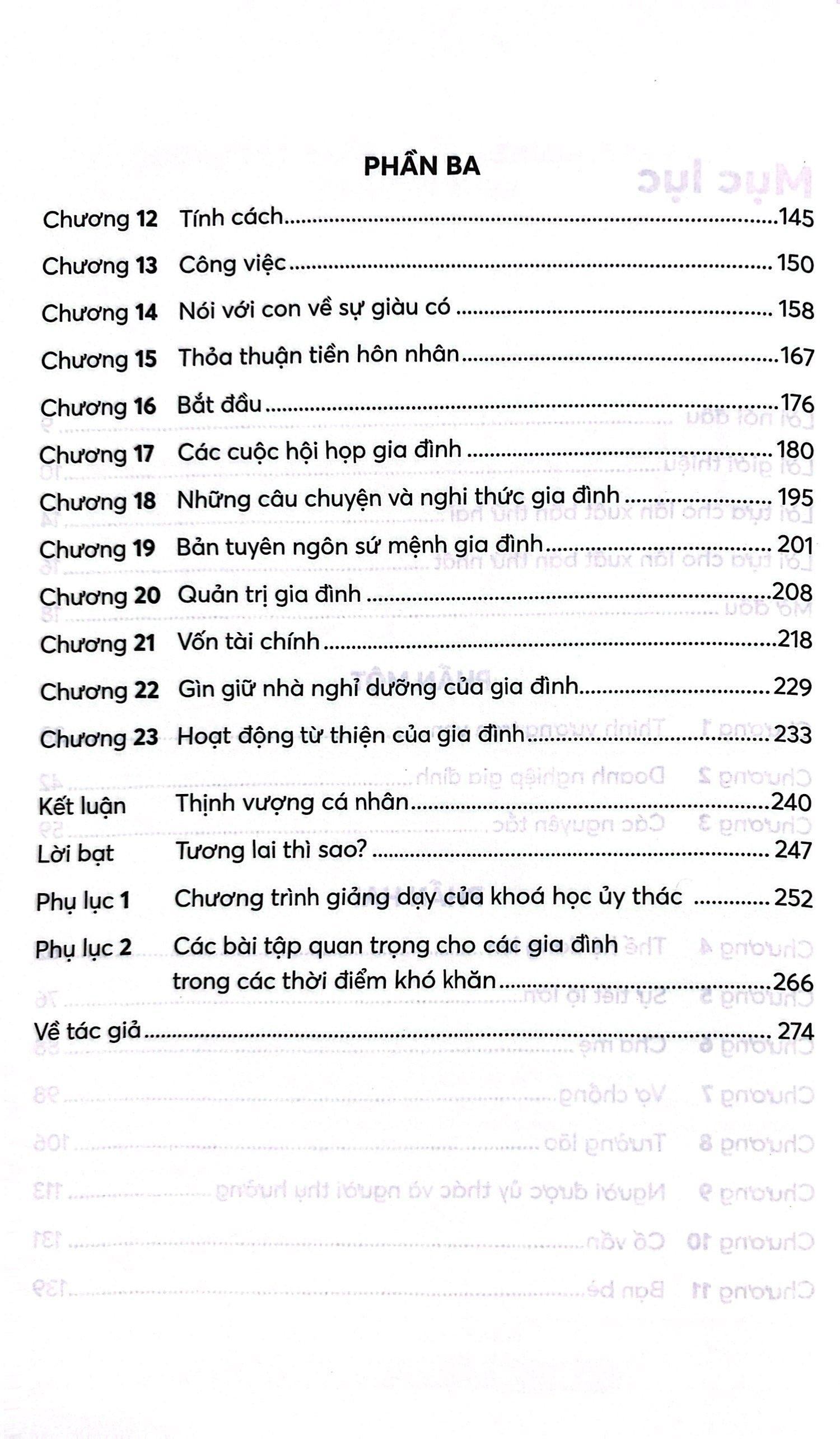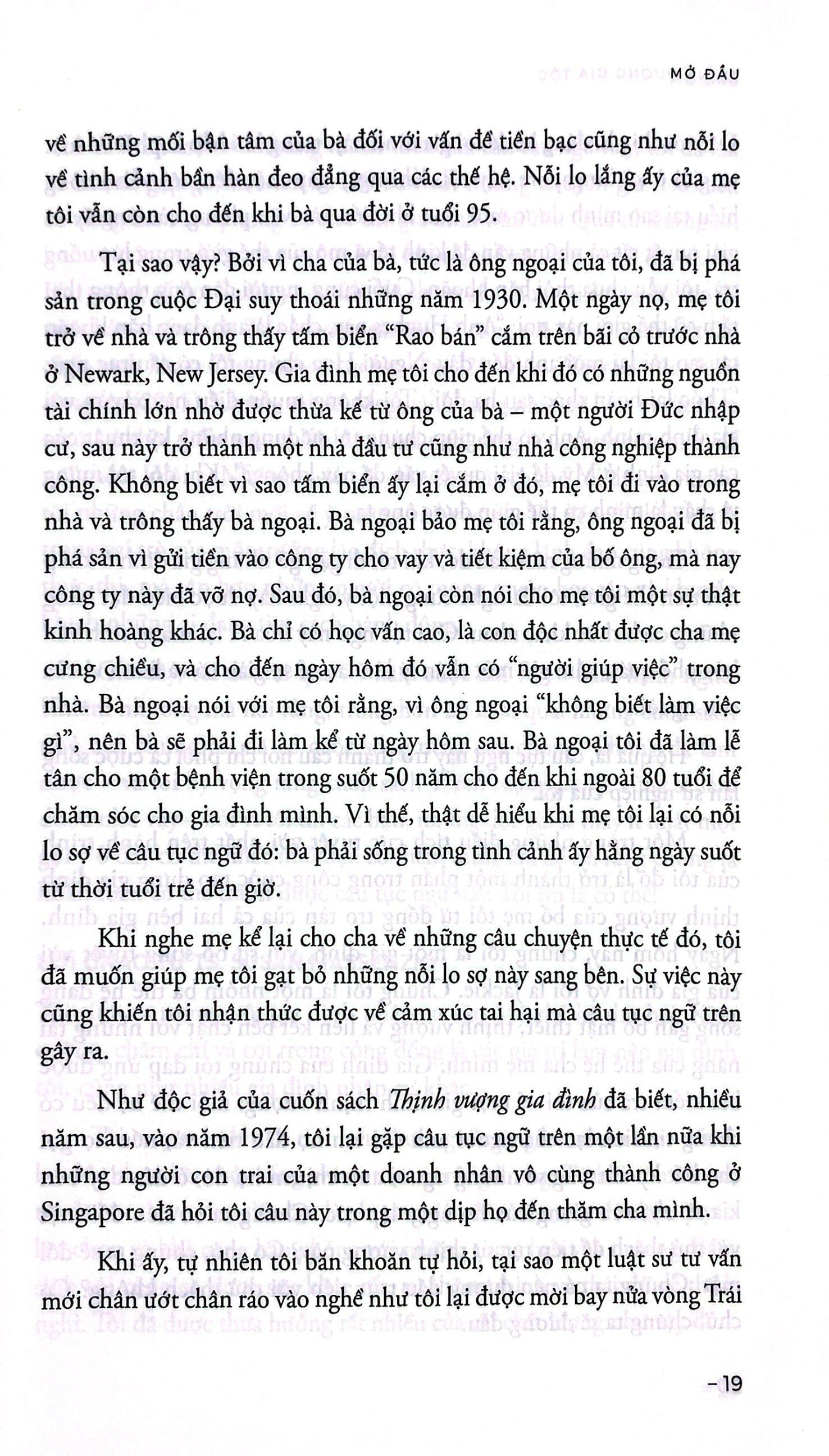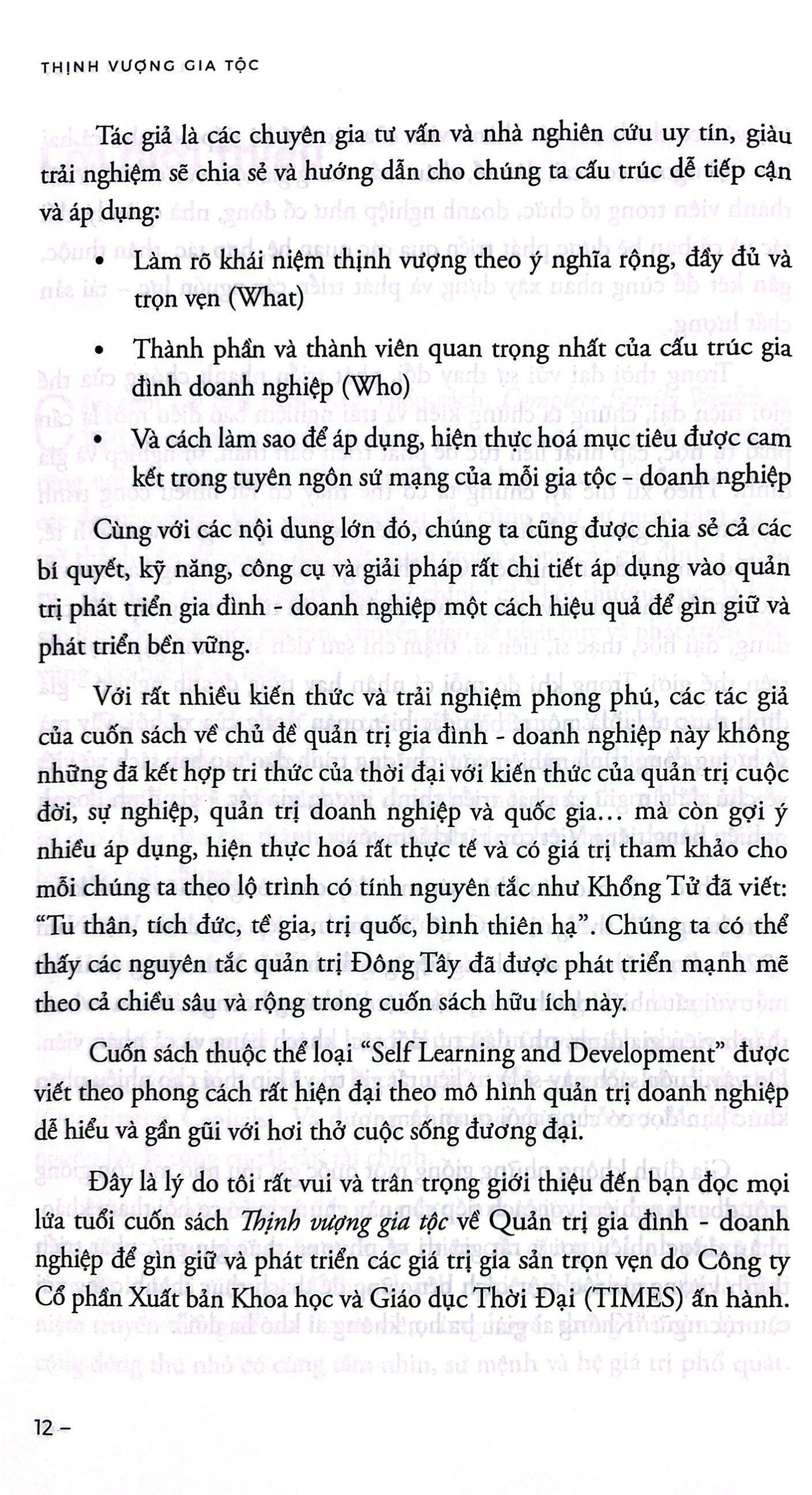 Thịnh Vượng Gia Tộc (Bìa mềm) Thịnh vượng gia tộc giúp chúng ta phát triển, duy trì và quản lý tài sản qua các thế hệ. Cuốn sách là tập hợp những hướng dẫn được cập nhật và mở rộng để thay đổi cách bạn nghĩ về sự giàu có và di sản của m.ình. Cuốn sách còn cung cấp câu trả lời bạn cần cùng với hướng dẫn và chiến lược để giữ nguyên khối tài sản của gia đình bạn. Thịnh vượng gia tộc cung cấp tư duy mới nhất về thịnh vượng, những ý tưởng và thực hành có ý nghĩa lâu dài để các gia đình duy trì, phát triển và quản lí tài sản qua các thế hệ. Cuốn sách là tập hợp những hướng dẫn được cập nhật và mở rộng để thay đổi cách chúng ta nghĩ về thịnh vượng và di sản của m.ình. Thịnh vượng đích thực vượt lên trên tiền bạc đơn thuần, bao gồm 6 loại gia sản: