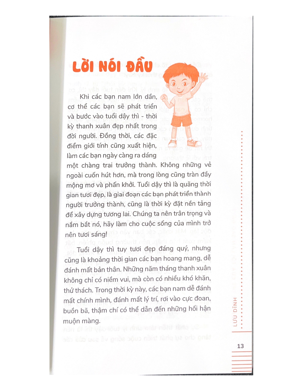 Khi các bạn nam lớn dần, cơ thể sẽ phát triển và bước vào tuổi dậy thì – thời kỳ thanh xuân đẹp nhất trong đời người. Tuổi dậy thì tuy tươi đẹp đáng quý, nhưng cũng là khoảng thời gian các bạn hoang mang, dễ đánh mất bản thân, đánh mất lí trí, rơi vào cực đoan, buồn bã, thậm chí có thể dẫn đến những hối hận muộn màng. THỜI TRAI TRẺ CỦA TÔI LÀM SAO ĐÂY? dành cho các bậc cha mẹ, thầy cô và các bạn nam đang độ tuổi dậy thì. Sách giúp mọi người hiểu về các đặc điểm, quy luật phát triển tâm sinh lý ở các bạn nam đang độ tuổi này, từ đó tìm ra phương pháp phù hợp cho việc giáo dục, nhằm giải quyết những trở ngại tâm lý mà các bạn nam tuổi dậy thì gặp phải trong cuộc sống và quá trình trưởng thành. Hy vọng sách sẽ giúp phụ huynh đưa ra các hướng dẫn có hiệu quả và giáo dục con khoa học hơn, đồng thời giúp các bạn nam vui vẻ trải qua thời thanh xuân tươi đẹp.