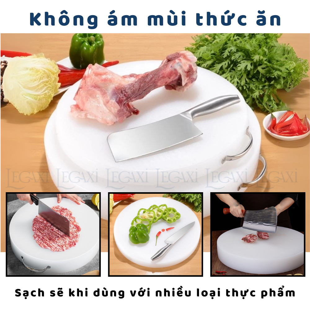THỚT NHỰA TRÒN CHO GIA ĐÌNH, NHÀ HÀNG, QUÁN ĂN CÔNG DỤNG SẢN PHẨM - Dùng để thái, chặt, cắt, băm thực phẩm: rau củ, thịt, cá, trái cây… - Chống thấm nước, không hút