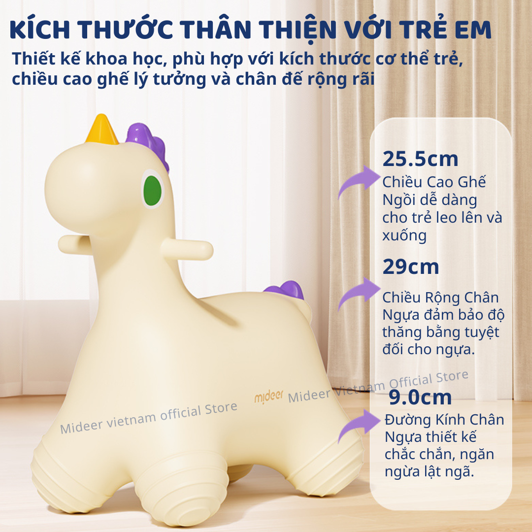 - KÍCH THƯỚC THÂN THIỆN VỚI TRẺ EM: Được thiết kế khoa học phù hợp với kích thước cơ thể trẻ, với chiều cao ghế lý tưởng và độ rộng chân đế hoàn hảo. -Chiều Cao Ghế Ngồi 25.5cm: Dễ dàng cho trẻ leo lên và xuống. -Chiều Rộng Chân Ngựa 29.0cm: Đảm bảo độ thăng bằng tuyệt đối cho ngựa. -Đường Kính Chân Ngựa 9.0cm: Thiết kế chắc chắn, ngăn ngừa lật ngã.
