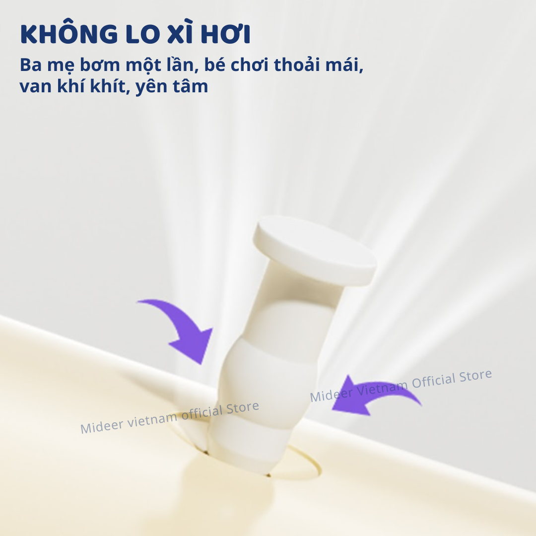 - KHÔNG LO XÌ HƠI! – Ba mẹ chỉ cần bơm một lần, bé chơi tự tin chơi vui hàng giờ thoải mái. Van khí khít với bơm, ba mẹ yên tâm cho con chơi thoải mái.