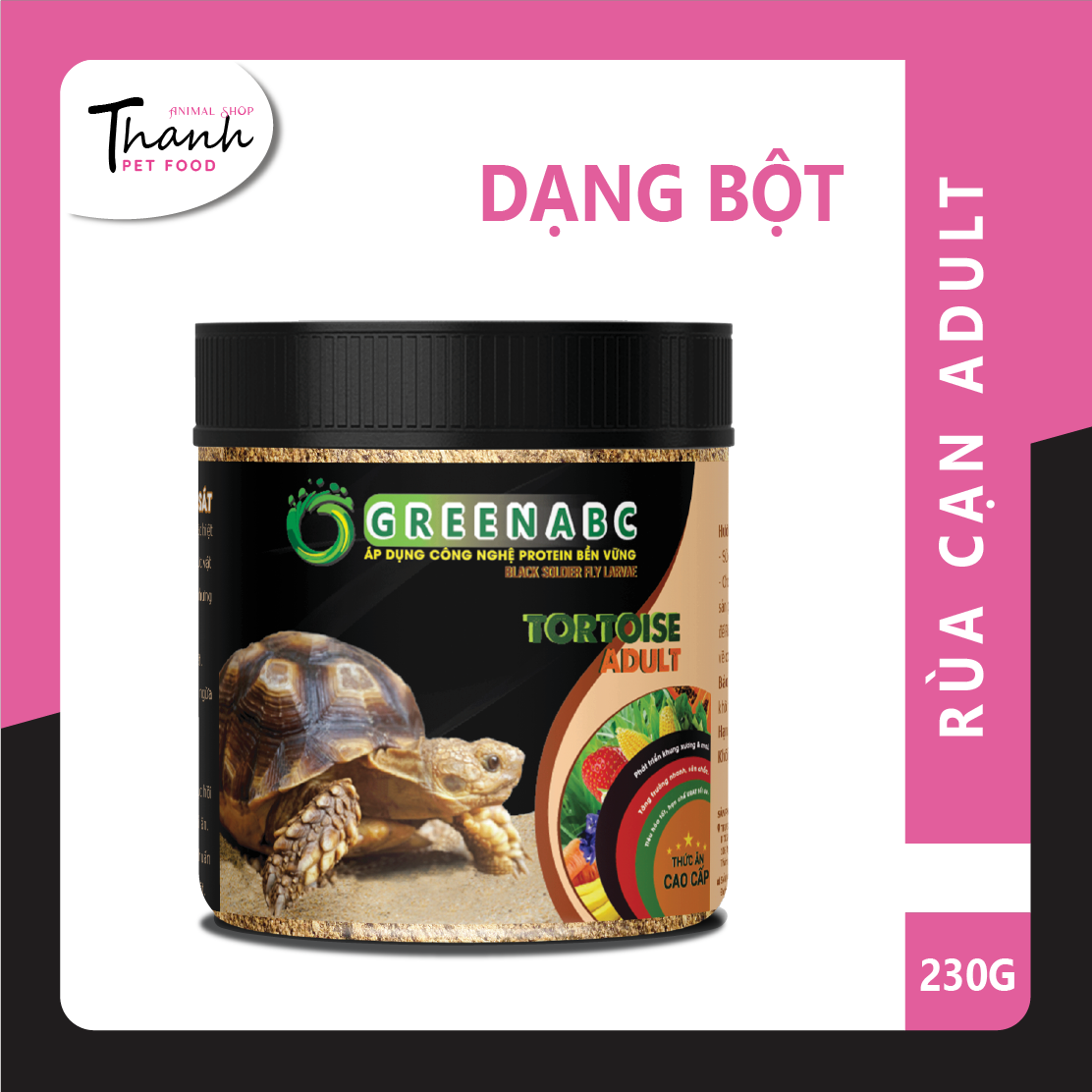 GREENABC - THỨC ĂN RÙA CẠN 100% TỪ THỰC VẬT - HÀM LƯỢNG PROTEIN 20% GREENABC là thức ăn cao cấp dành cho các loại RÙA CẠN. Đặc biệt sản phẩm GREENABC được sản xuất