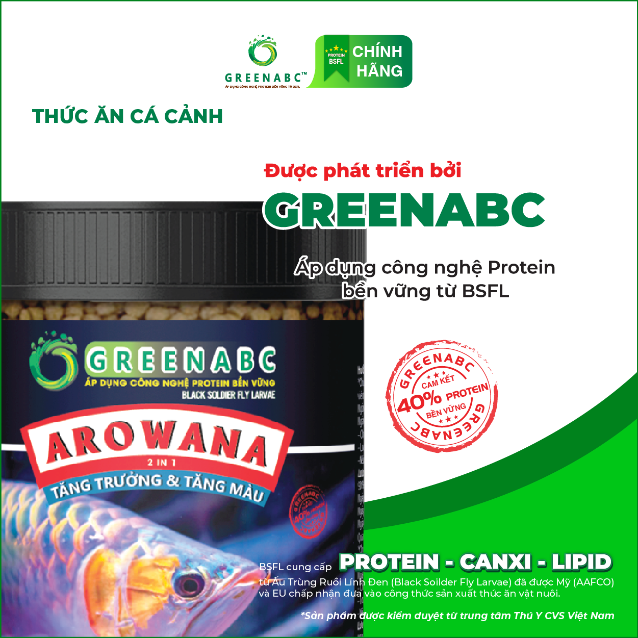 GREENABC - THỨC ĂN CÁ RỒNG - HÀM LƯỢNG PROTEIN > 40% GREENABC là thức ăn cao cấp dành cho CÁ RỒNG. Đặc biệt sản phẩm GREENABC được sản xuất theo phương pháp Áp dụng