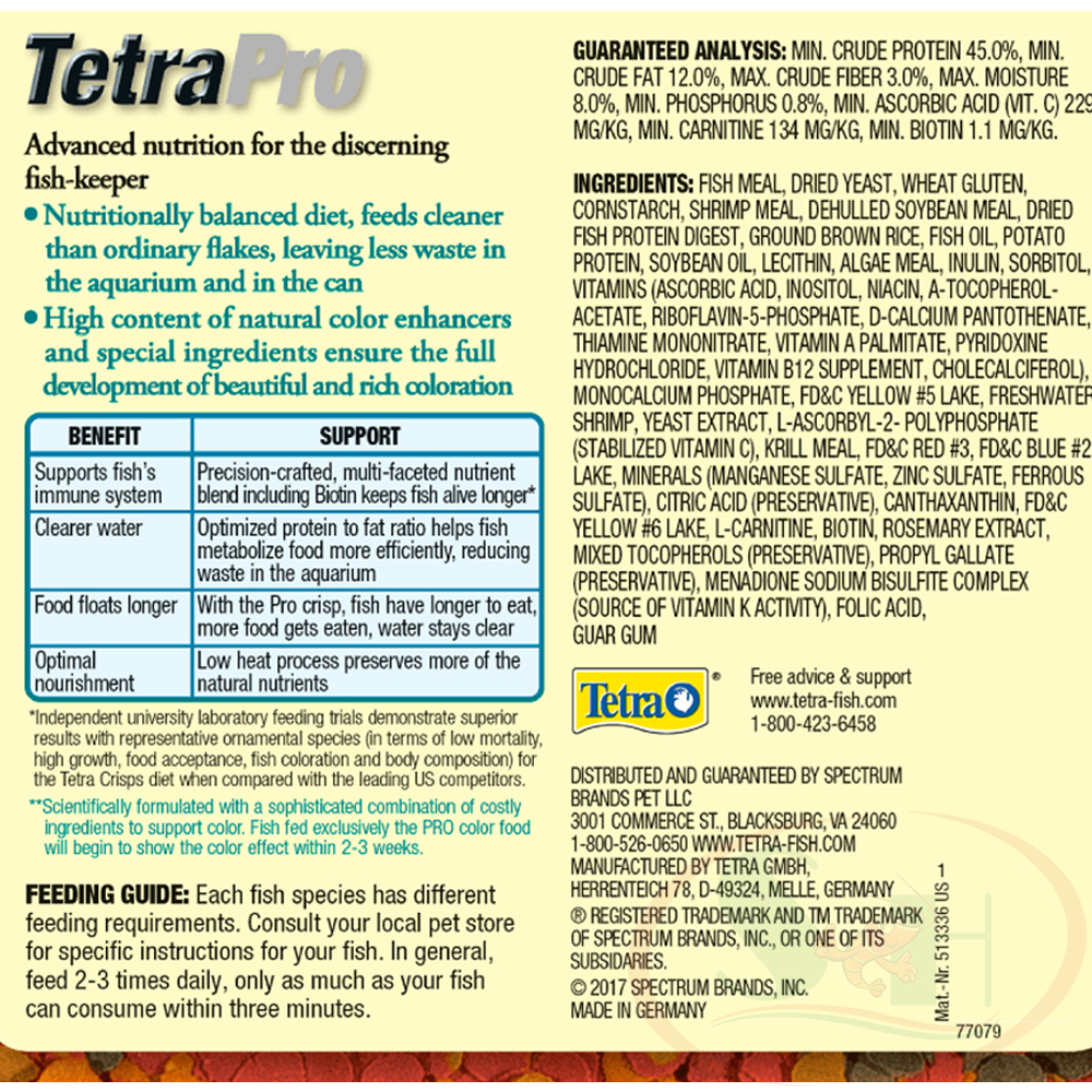 Thức ăn cá Tetra TetraPro Tropical Color Crisps là dòng thức ăn cá cảnh được tăng cường thêm vitamin C và công nghệ ProCare tăng cường sức khỏe được cấp bằng sáng chế ở CHLB Đức.