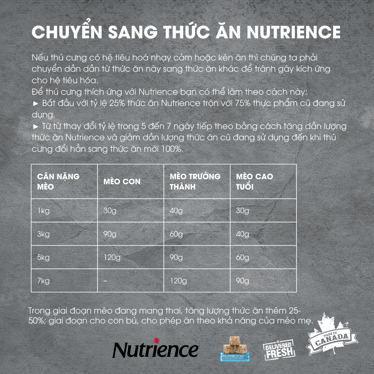 Điều quan trọng là phải chuyển dần dần chú mèo cưng của bạn từ thức ăn này sang thức ăn khác để tránh gây kích ứng cho hệ tiêu hóa. Bắt đầu với tỷ lệ 25% thức ăn Nutrience trộn với 75% thực phẩm cũ đang sử dụng. Từ từ thay đổi tỷ lệ trong 5 đến 7 ngày tiếp theo bằng cách tăng dần lượng thức ăn Nutrience và giảm dần lượng thức ăn cũ đang sử dụng.