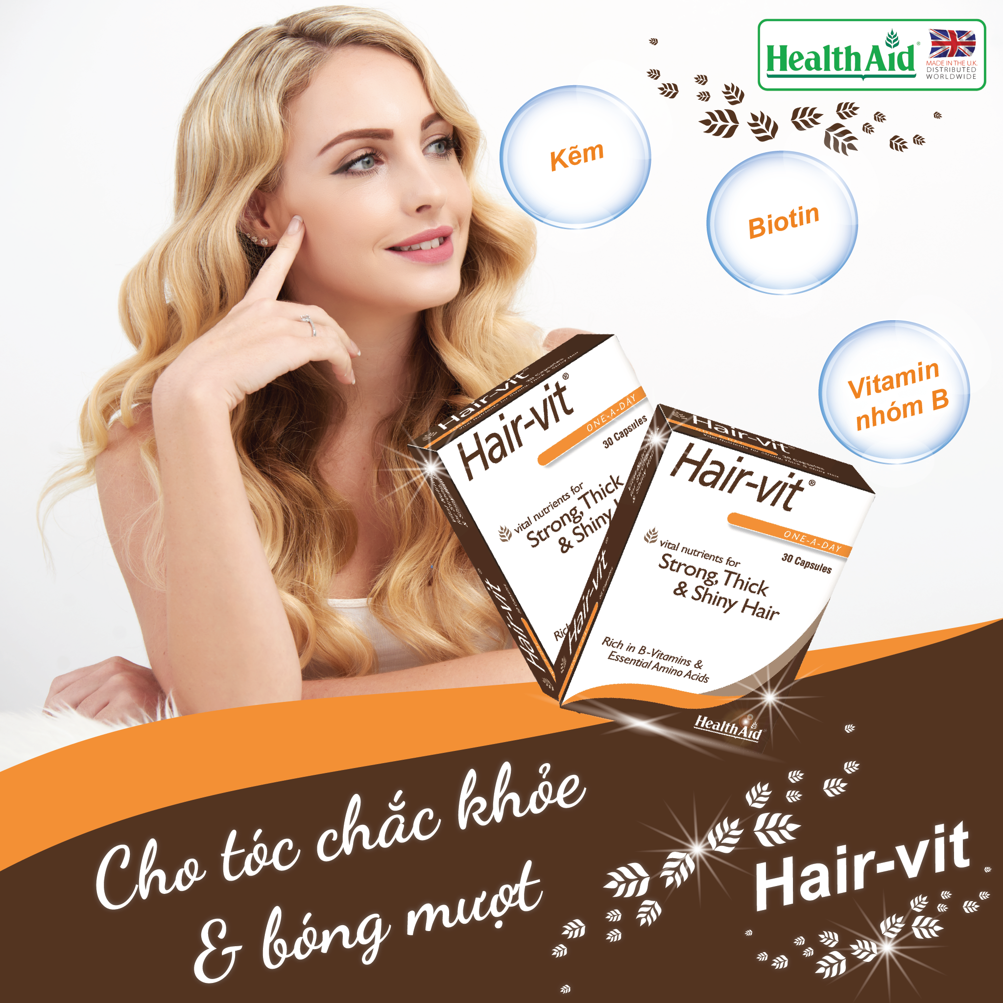 - Cung cấp vitamin, khoáng chất và dưỡng chất giúp kích thích mọc tóc, dưỡng tóc chắc, khỏe, đẹp. HealthAid là nhà cung cấp hàng đầu về các loại vitamin, khoáng chất, dược liệu và chất bổ sung có thương hiệu ở Anh trên 37năm. Danh mục sản phẩm mở rộng của nó bao gồm hơn 560 sản phẩm, được lưu trữ tại hơn 4.000 hiệu thuốc độc lập và cửa hàng thực phẩm sức khỏe; nó cũng được phân phối cho gần 70 quốc gia trên toàn thế giới. HealthAid chuyên cung cấp các sản phẩm chất lượng cao đã được các chuyên gia, nghiên cứu khoa học đầy đủ, bài bản, sử dụng công thức độc đáo và sáng tạo, chỉ chứa các thành phần tốt nhất, sản phẩm được sản xuất tại nhà máy đạt tiêu chuẩn GMP của Châu Âu và được hỗ trợ bởi mạng lưới phân phối đội ngũ bán hàng chuyên nghiệp có kinh nghiệm cao được hỗ trợ bởi tiếp thị đẳng cấp thế giới và chuyên môn dinh dưỡng.