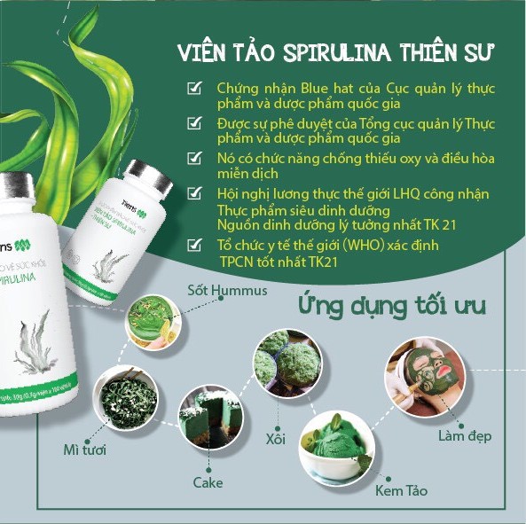 - 6 Tảo Spirulina với dinh dưỡng trẻ em Tảo Spirulina có dinh dưỡng toàn diện, phong phú, dễ hấp thụ, là biện pháp nhanh nhất bổ sung dinh dưỡng một cách khoa học cho trẻ em. Thực phẩm bảo vệ sức khoẻ viên tảo Spirulina Thiên Sư là thực phẩm chức năng có nguyên liệu được làm từ bột tảo khô thuần thiên nhiên chất lượng cao. Có tác dụng tăng cường khả năng chịu đựng trong môi trường thiếu oxy và điều tiết miễn dịch Hướng dẫn sử dụng: Ngày uống 2-3 lần, mỗi lần 6 viên. Uống với nước ấm. Bảo quản: Để ở nơi khô mát, tránh ánh nắng sáng.