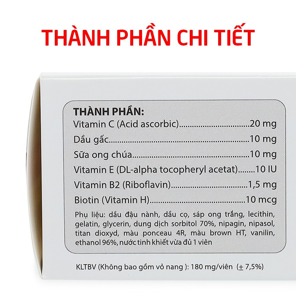 Thành phần: Trong mỗi viên có chứa: L-Cystine: 500mg Vitamin E (DL-alpha-tocopheryl acetat)...7IU Sữa ong chúa:.500mcg Biotin:.15mcg Phụ liệu: Gelatin, dầu nành, dầu cọ, sáp ong, lecithine, glycerin, sorbitol, nipazil, nipazol, ethyl vanillin, titan dioxyd,