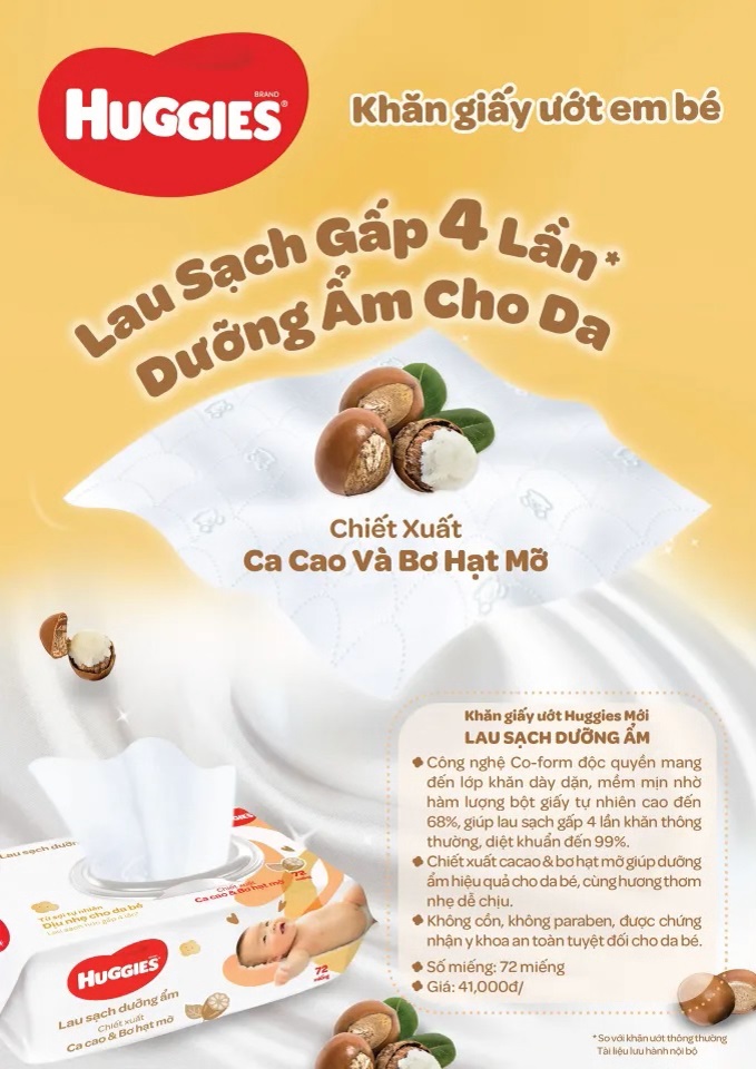 Mua tại TiktokBỘ SẢN PHẨM BAO GỒM 01 x Thùng 12 gói khăn giấy ướt cho trẻ sơ sinh HUGGIES (Gói 72 tờ) MÔ TẢ SẢN PHẨM Công nghệ co-form độc quyền mang đến lớp khăn dày dặn, mềm mịn nhờ hàm lượng bột giấy tự nhiên cao lên đến 68%, giúp lau sạch gấp 4 lần khăn thông thường, diệt khuẩn đến 99.9% Chiết xuất ca cao & bơ hạt mỡ giúp dưỡng ẩm hiệu quả cho da bé, cùng hương thơm nhẹ dễ chịu. Không cồn, không paraben, được chứng nhận y khoa an toàn tuyệt đối cho da bé. Số miếng: 72 miếng. HSD: 2 năm từ NSX Xuất xứ: Việt Nam