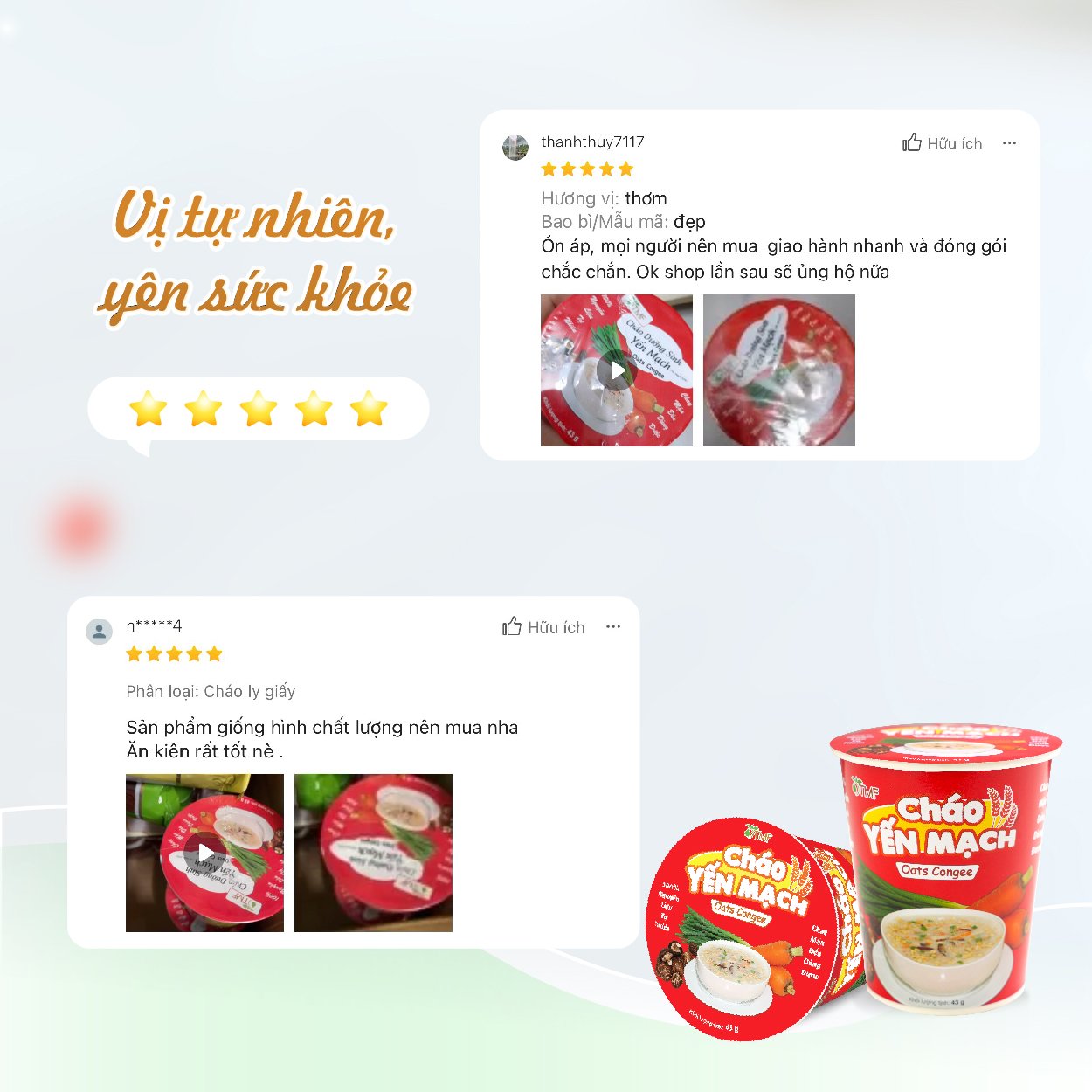 Combo 6 Gói Cháo Yến Mạch Rau Nấm Gói 40G [chay dùng được] Cháo Yến Mạch rau nấm giàu năng lượng và dưỡng chất từ thực vật, thơm ngon không dầu mỡ. Nấm và các loại rau củ được sấy theo công nghệ sấy thăng hoa, vẫn giữ được đầy đủ Vitamin và hương vị tự nhiên. Giá trị dinh dưỡng cho 1 gói cháo 40g Chất đạm g ≥ 4.00 Chất xơ g ≥ 2.10 Năng lượng Kcal ≥ 120 Chất béo g ≥ 2.00 Carbohydrate g ≥ 21.80 Đối tượng sử dụng: Trẻ em trên 36 tháng tuổi và người lớn. Quy cách đóng gói: 40g/ gói Thành phần: Gói cháo yến mạch nguyên chất (60%), phôi cháo gạo. Gói rau củ: nấm đông cô sấy thăng hoa (2%); cà rốt, paro, ngò rí sấy thăng hoa. Gói soup bột: hạt nêm nấm hương và hạt sen, muối iốt, đường, bột tiêu, maltodextrin, bột gia vị, chất chống đông vón (551), hương tổng hợp dùng cho thực phẩm. Hướng dẫn sử dụng: Cho gói cháo, gói soup bột và gói rau củ vào tô. Chế nước vừa đun sôi vào tô (khoảng 350ml) Đậy kín tô để trong 3 phút. Mở nắp tô, trộn đều là dùng được ngay.