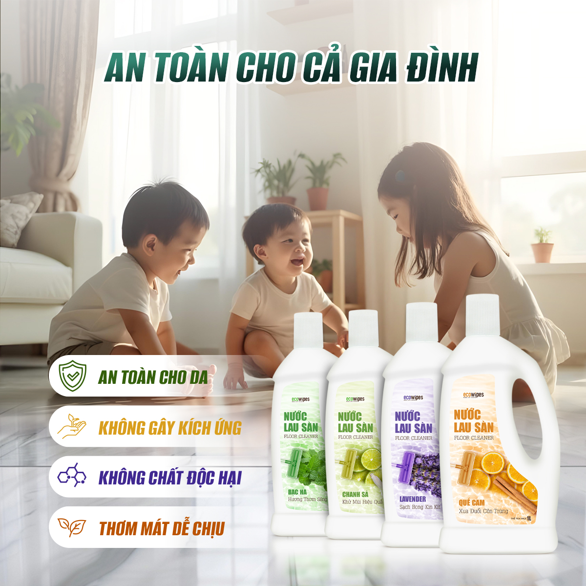 Nước lau sàn EcoWipes là lựa chọn hoàn hảo cho những ai mong muốn không gian sống sạch sẽ, an toàn và tươi mát. Sản phẩm kết hợp công nghệ làm sạch tiên tiến với các thành phần thân thiện với môi trường, mang đến giải pháp vệ sinh tối ưu cho mọi loại sàn nhà.