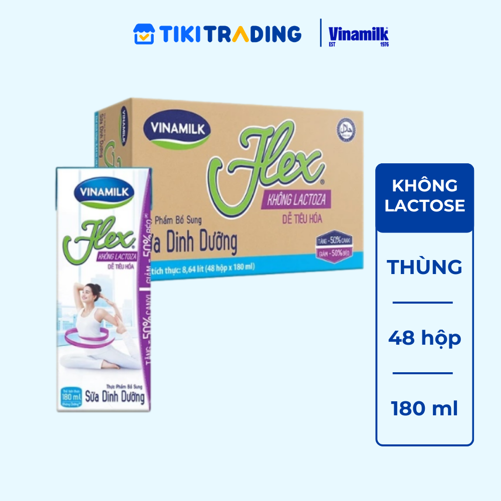 Mua tại Tiktok- Thùng 48 Hộp Sữa tiệt trùng Vinamilk Flex không Lactose (180ml) dành cho cả gia đình, đặc biệt phù hợp cho các đối tượng muốn uống sữa để bổ sung Canxi và Vitamin D nhưng lại có hiện tượng sôi bụng và khó tiêu do cơ thể không dung nạp Lactoza.