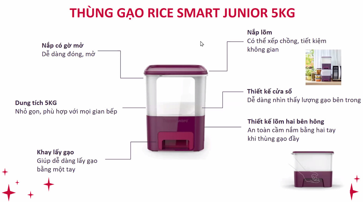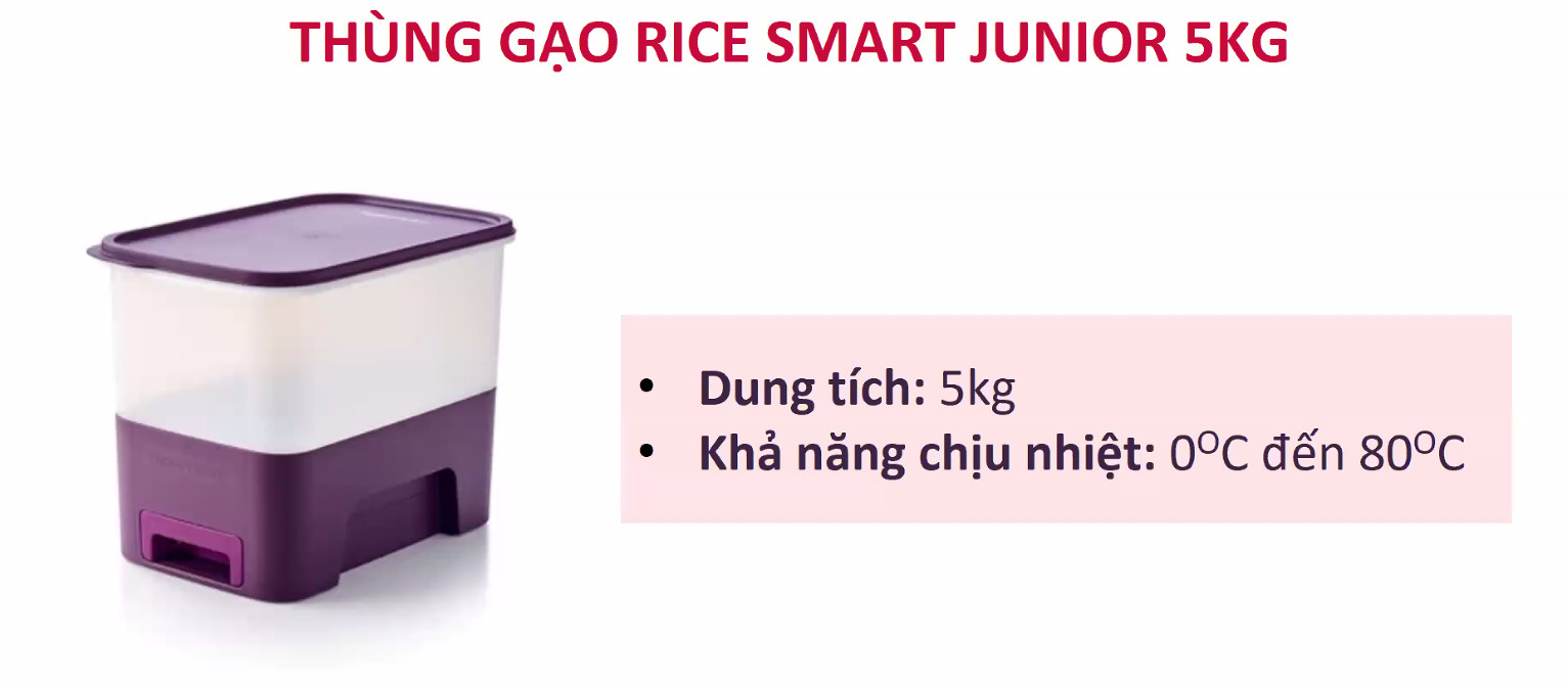 Công dụng: - Với dung tích nhỏ gọn 5kg, sản phẩm thùng gạo Rice Smart Junior phù hợp với việc bảo quản các loại thực phẩm như gạo, nếp, gạo lứt, hạt dinh dưỡng,…