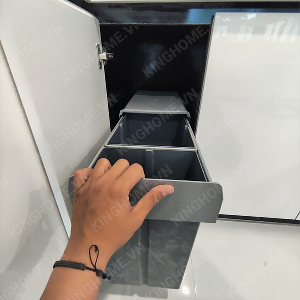 - Kiểu dáng sang trọng, ray hộp đẳng cấp giúp căn bếp thêm hiện đại. - Chỉ cần kéo cánh tủ ra (vào) là thùng tự động ra (vào) theo để bạn cho rác vào