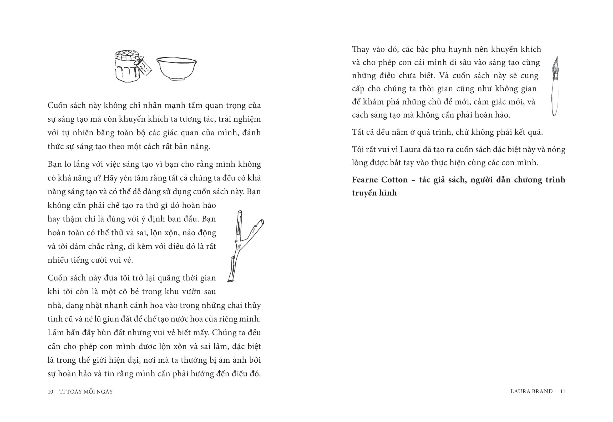 Tí Toáy Mỗi Ngày – 50 Ý Tưởng Thủ Công Sáng Tạo Tại Nhà “Đắm mình trong dòng chảy sáng tạo không chỉ là niềm vui của con trẻ mà còn giúp các bậc phụ huynh đang kiệt sức có cơ hội để thư giãn và kết nối với đứa trẻ bên trong của mình.” - Laura Brand Trong “vương quốc” hiện đại với bao sự tiện ích, các em nhỏ dường như không thiếu cách giải trí nhưng lại bị tước đi niềm vui căn bản nhất - được vui chơi tự do và sáng tạo cùng ba mẹ của mình. Vậy ba mẹ nên làm thế nào để có thể cùng con thoát khỏi những gò bó của thế giới bên ngoài và đắm mình vào dòng chảy sáng tạo một cách tự nhiên? Câu trả lời sẽ nằm trong Tí toáy mỗi ngày - 50 ý tưởng thủ công sáng tạo tại nhà. Một cuốn sách mộng mơ tập hợp bên trong biết bao ý tưởng độc-nhất-vô-nhị, đánh thức trí tò mò cùng óc tưởng tượng của ngay cả những người lớn khó tính nhất. Đặc biệt là, cùng cuốn sách này, cả gia đình có thể chơi cùng nhau ở bất cứ đâu: trong bếp, phòng tắm, ngoài sân, Thế giới ngoài kia sẽ chẳng còn hiện hữu, thay vào đó là sự kết nối đầy ý nghĩa với con và tái-kết nối với chính mình. Vậy còn chần chừ gì nữa, xin mời bạn bước vào thế giới kỳ thú của Tí toáy mỗi ngày và khám phá ngay thôi! Về tác giả Laura Brand là một họa sĩ vẽ tranh minh họa và là mẹ của hai đứa trẻ. Cô sống ở ngoại thành cùng chồng, hai cô con gái, hai chú cún, hai chú mèo và một đàn gà. Cô thường xuyên chia sẻ những trải nghiệm thủ công và ý tưởng sáng tạo của mình để chơi hàng ngày cùng con trên nền tảng ram của mình: @thejoyjournal.