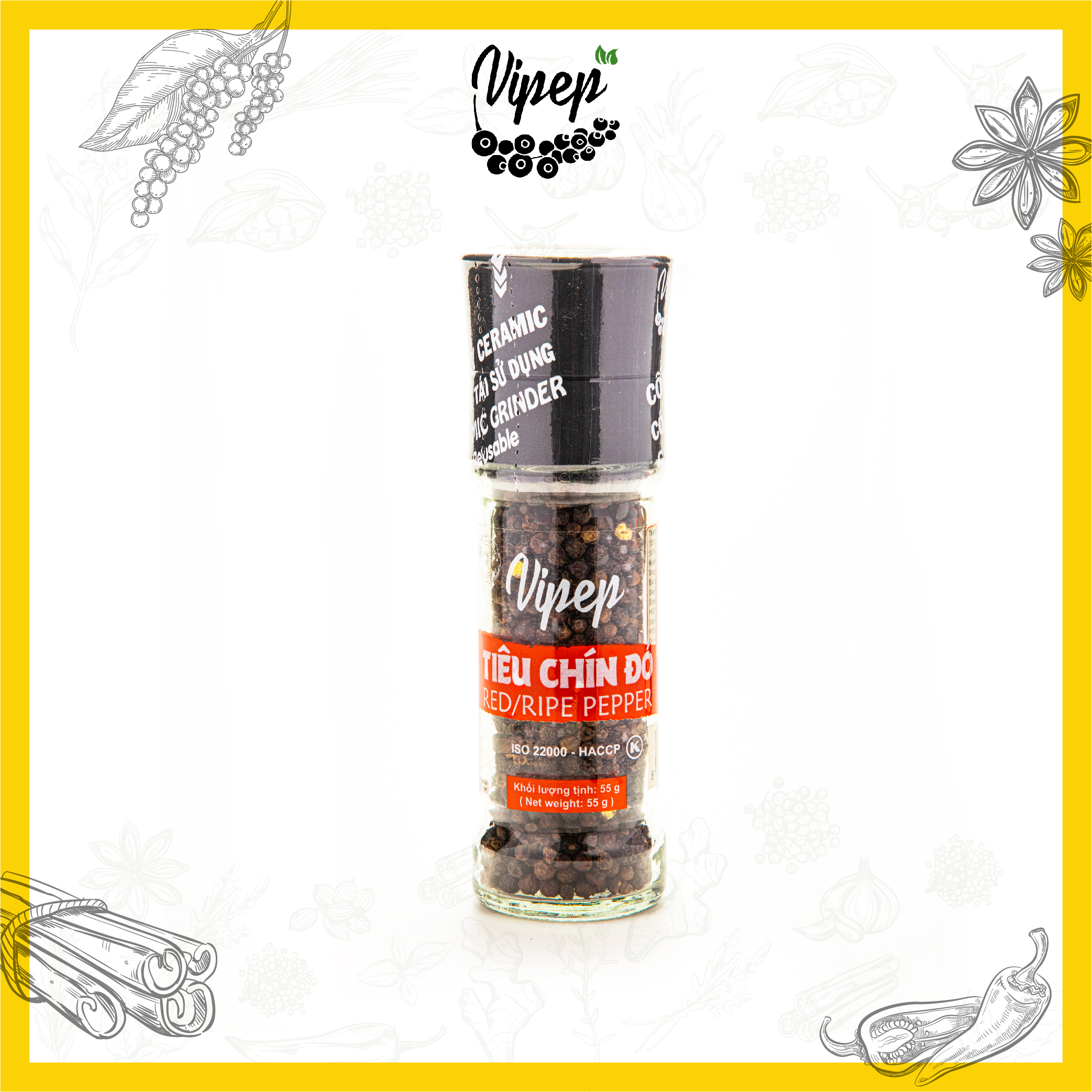 ✨Tiêu Đen Hạt Chín Đỏ Tự Nhiên Cối Xay Vipep Hũ Thủy Tinh 55g