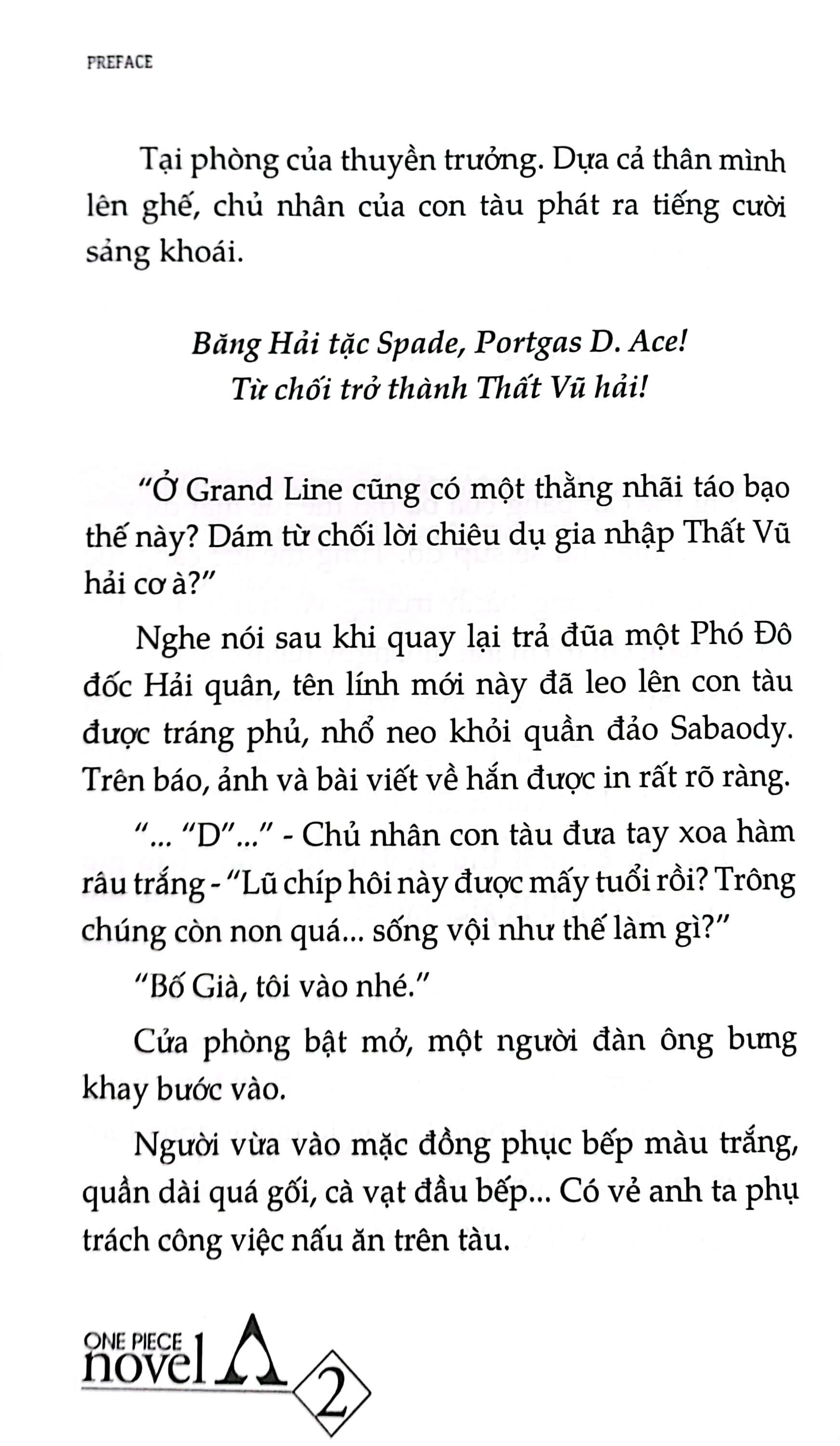 ONE PIECE - CHUYỆN VỀ ACE là bộ tiểu thuyết gồm 2 tập, tiết lộ toàn bộ quá trình băng hải tặc Spade tiến vào Tân Thế giới, và cuộc đụng độ với băng Hải tặc Râu trắng về sau. Sách được NXB Kim Đồng làm với hình thức đẹp, với phần bìa áo tráng kim lấp lánh, bao ngoài là Obi giấy can trong suốt.
