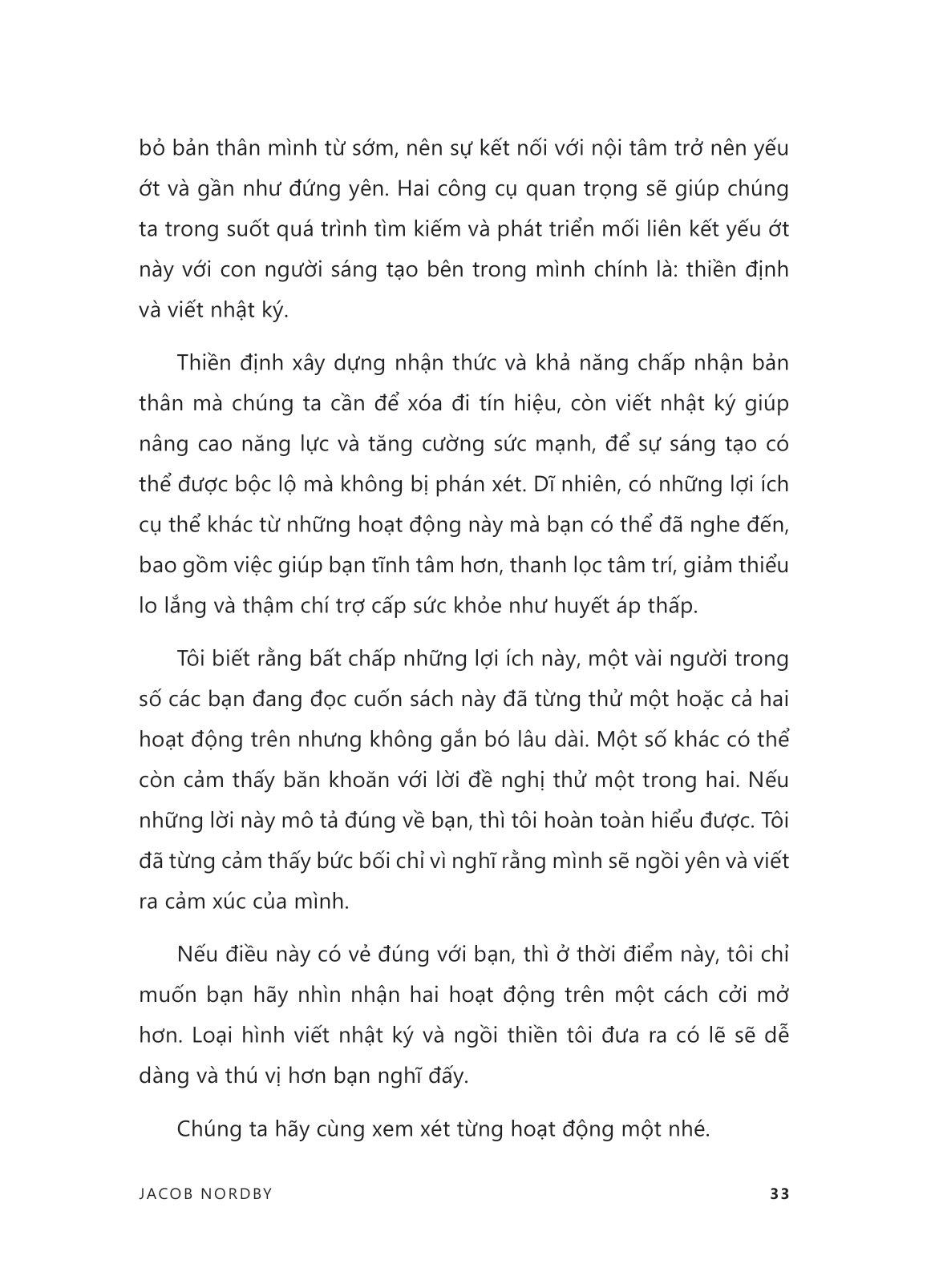 Jacob Nordby - tác giả, nhà huấn luyện sáng tạo. Khi bước sang tuổi 30, anh ấy đã điều hành một công ty và sống trong một ngôi nhà lớn với những chiếc xe sang trọng. Nhưng anh cảm thấy như m.ình đang chết dần trong lòng. Từ đó, anh đã bắt đầu và duy trì thực hành sáng tạo. Ngay trong cuốn sách này, anh đã giải thích cách bản thân thay đổi và có được lối sống đầy ý nghĩa, đồng thời đưa ra các bước cụ thể để giúp bạn xây dựng phương pháp sáng tạo của riêng m.ình.