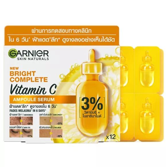 - Tinh Chất Cô Đặc Tăng Cường Sáng Da Mờ Thâm Garnier New Bright Complete Vitamin C Ampoule Serum 12 x 1.5ml hiện đã có mặt tại Thế Giới Skinfood Thành phần chiết xuất 100% từ thực vật, sản phẩm chứa Vitamin Cg giúp chống oxy hóa. Đặc biệt hiệu quả khi còn kết hợp cùng Niacinamide giúp tăng cường độ sáng cho da và mờ thâm quầng mắt, thâm mụn.