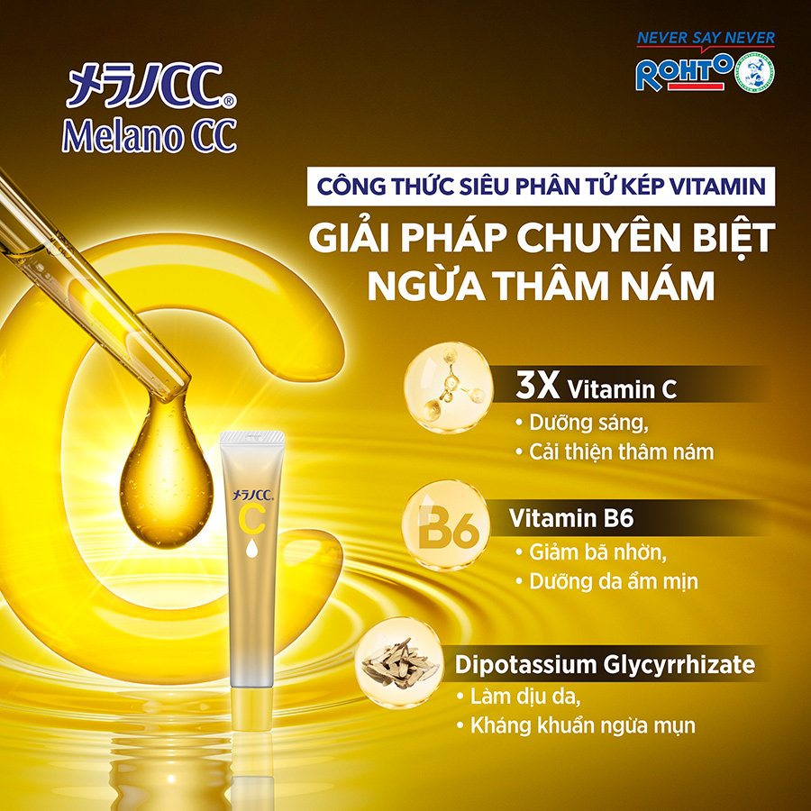 Thành phần chính và công dụng: Tinh chất vitamin C dưỡng trắng Melano CC với công dụng làm mờ thâm nám, làm sáng thâm mụn và dưỡng da sáng mịn đều màu